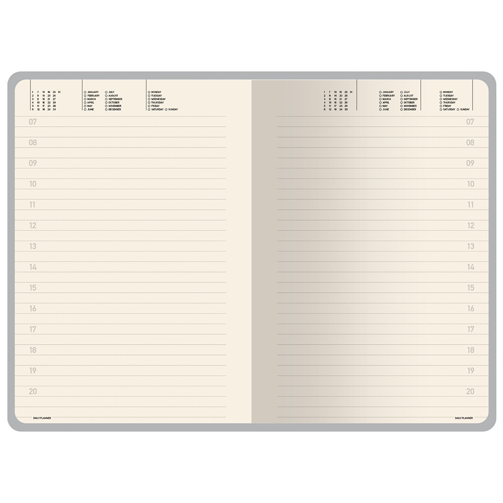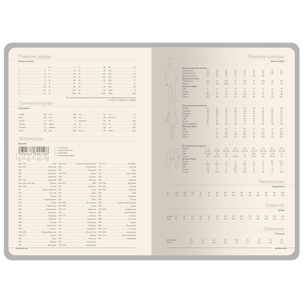Недатированные страницы в серую линейку имеют отдельное место для проставления числа месяца и дня недели. Справочный блок на 17 страницах содержит полезную информацию из различных областей.