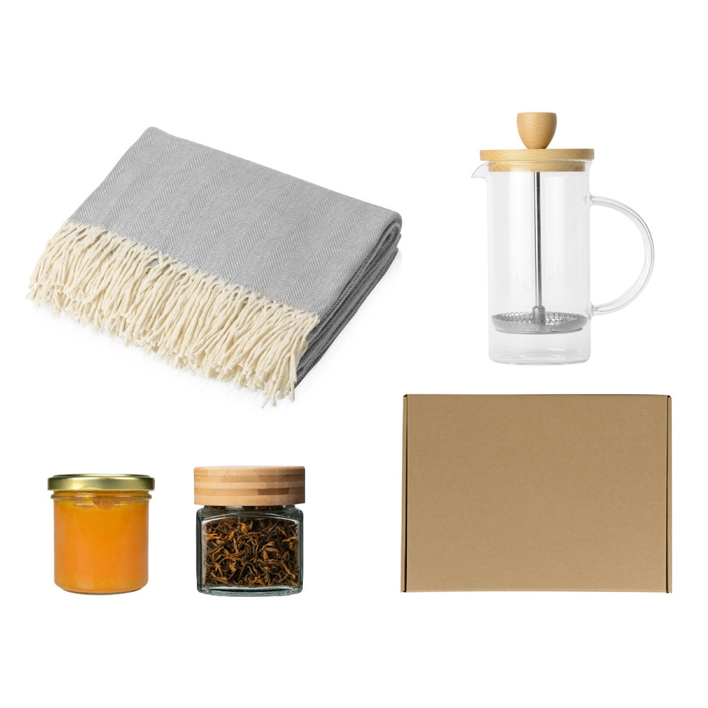 Подарочный набор с пледом, френчпрессом, чаем и вареньем, серый