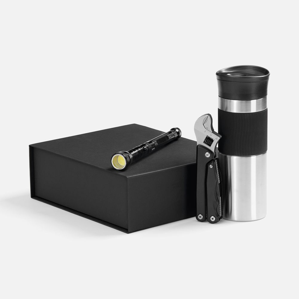 Компактный мультитул, гибкий фонарь и большой герметичный термостакан — все, что нужно для ремонта, строительства или работы в гараже. Емкость термостакана 450 мл.