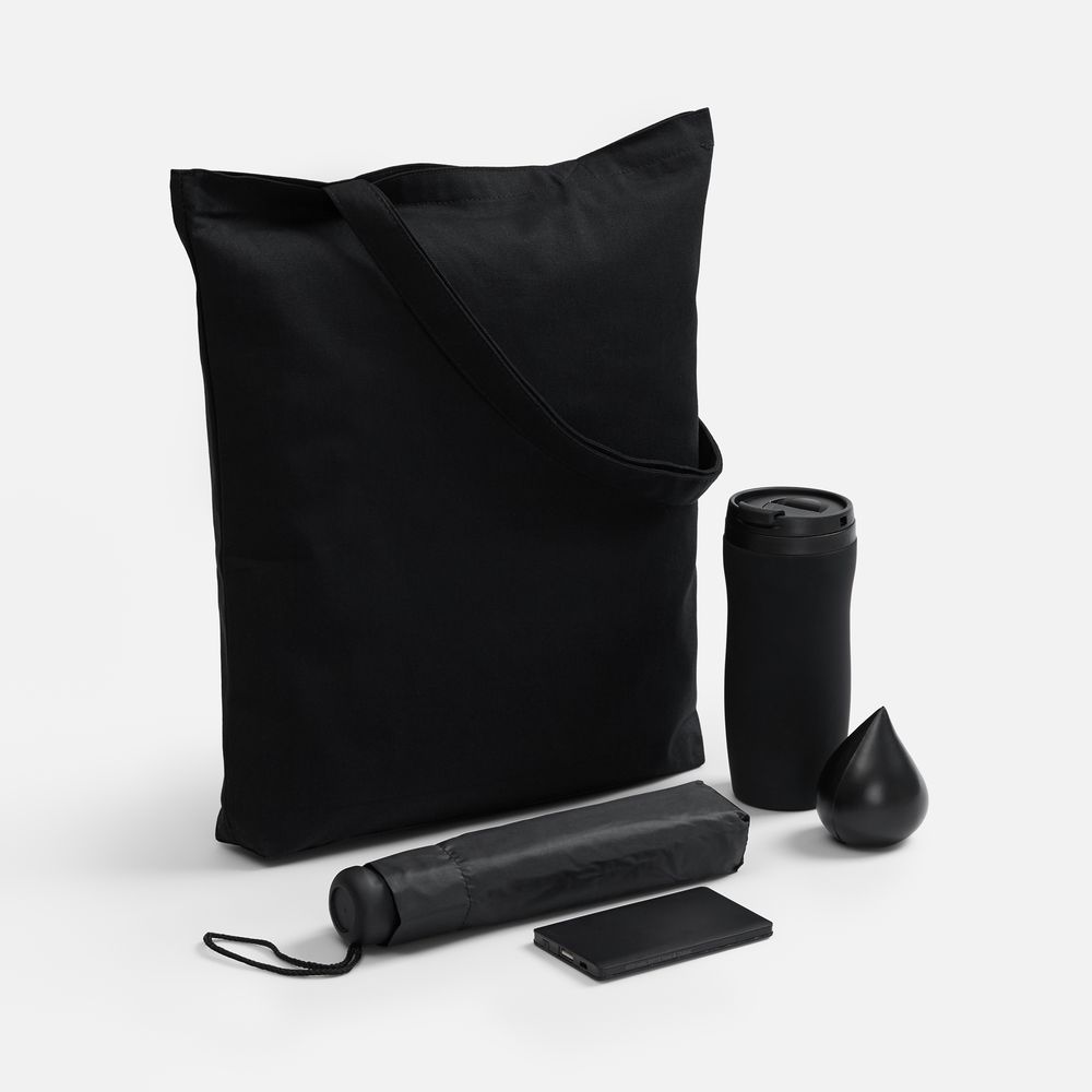 - зонт - полиэстер 190T, ручка - пластик; покрытие софт-тач; каркас, спицы - металл; аккумулятор - пластик; крышка термостакана, внутренняя колба - пластик, корпус - нержавеющая сталь; покрытие софт-тач; сумка - хлопок 100%, плотность 210 г/м²; антистресс - вспененный полиуретан