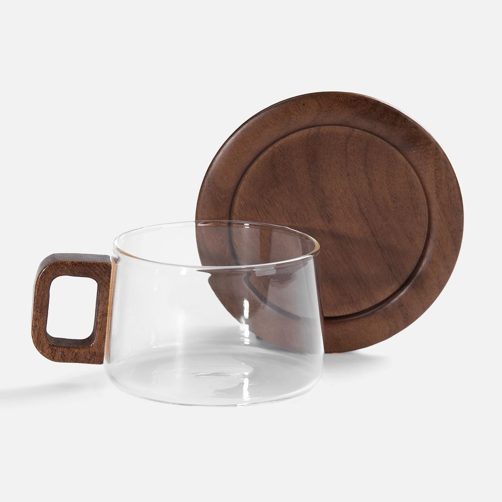 Чайная пара с чашкой из прочного боросиликатного стекла в сочетании с элементами из ореха станет изюминкой домашней или офисной подачи горячих напитков.