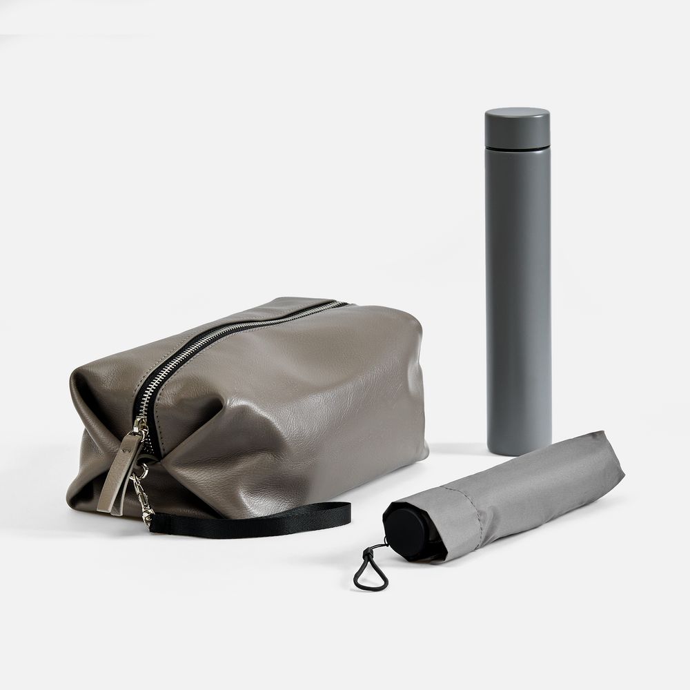 - несессер - искусственная кожа; зонт - полиэстер, 300Т, спицы - стеклопластик; ручка - прорезиненный пластик; бутылка - нержавеющая сталь, 304 внутри, 201 снаружи; матовое покрытие