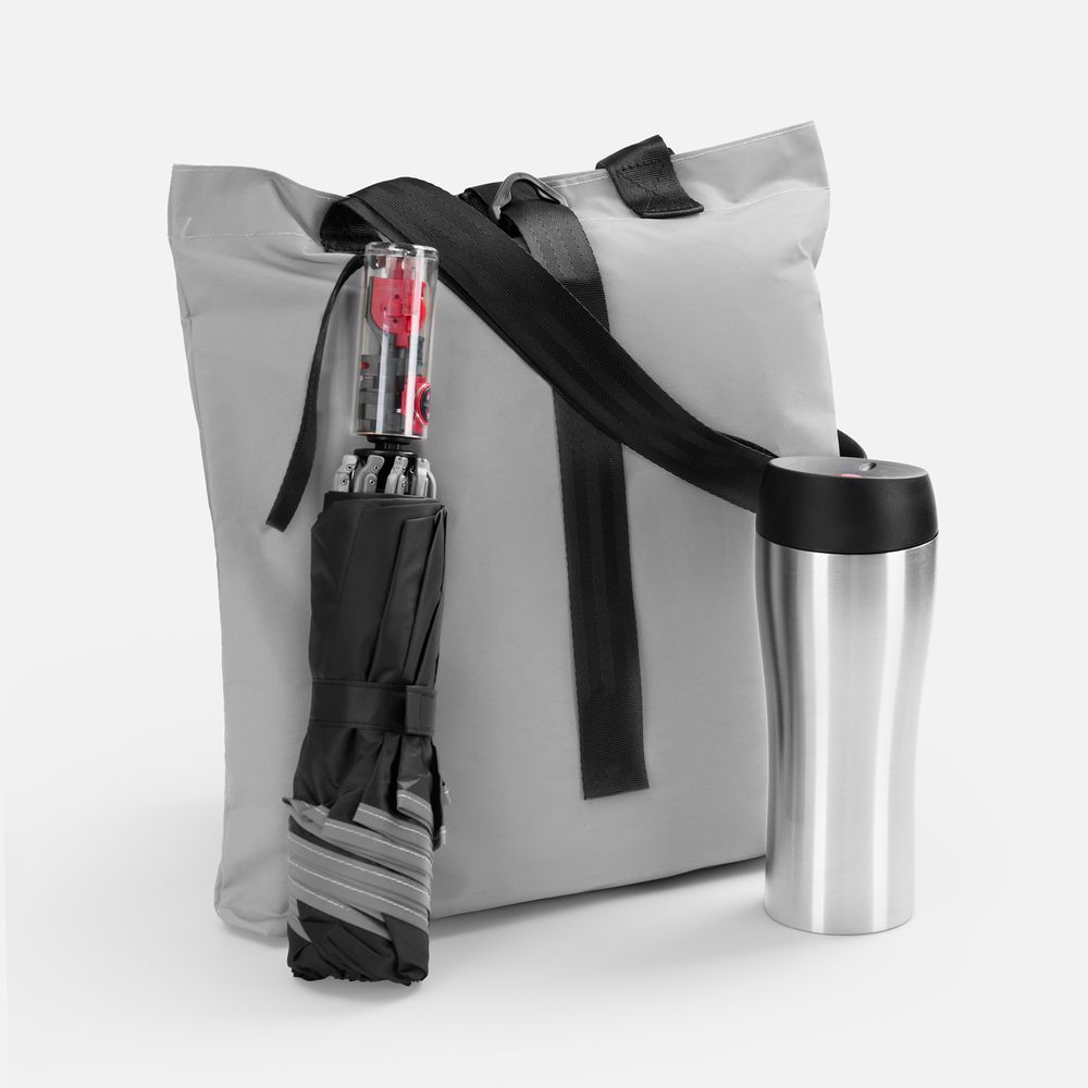 В набор Future Manifest входят необычный складной зонт наоборот и вакуумный термостакан с высокими показателями удержания температуры, упакованные в шопер из светоотражающей ткани, — идеальный аксессуар для комфортных и безопасных прогулок в любое время суток.