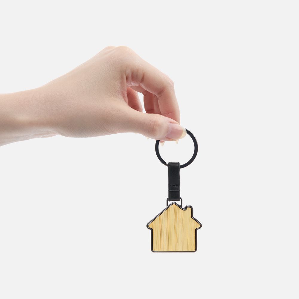 Металлический брелок со вставкой из бамбука и петлей из искусственной кожи. Подойдет для клиентов, отдающих предпочтение качественным материалам.