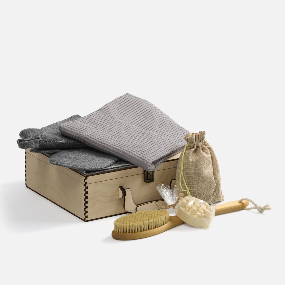 - кейс - дерево; банная шапка, коврик, рукавица - шерсть, 40%, полиэфир 60%; войлок; килт - хлопок 100%, плотность 240 г/м²; щетка - дерево, карельская береза; щетина кабана средней жесткости