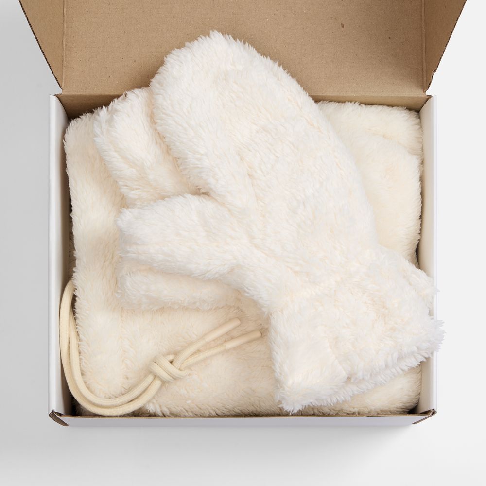 - балаклава - полиэстер 100%, плотность 280 г/м², длинноворсовый флис; варежки - полиэстер 100%, плотность 280 г/м², длинноворсовый флис; коробка - микрогофрокартон, плотность 385 г/м²