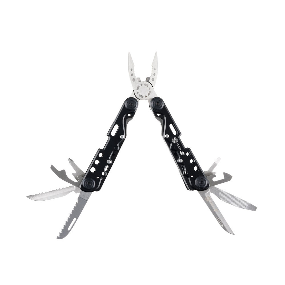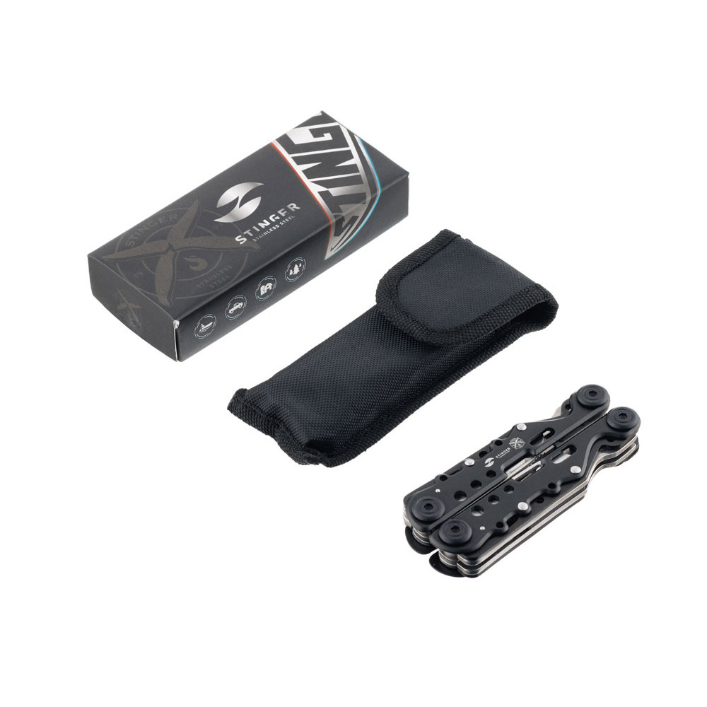 МНОГОФУНКЦИОНАЛЬНЫЙ ИНСТРУМЕНТ STINGER С НАБОРОМ ИЗ 13 ФУНКЦИЙ: 1. Острогубцы   2. Пассатижи 3. Кусачки 4. Лезвие большое плоское 5. Лезвие с серрейторной кромкой 6. Пила по дереву и металлу 7. Напильник по дереву и металлу 8. Отвёртка крестовая 9. Отвёртка шлицевая большая 10. Отвёртка шлицевая малая 11. Инструмент для снятия изоляции 12. Открывалка для бутылок 13. Консервный нож ХАРАКТЕРИСТИКИ: Материал инструментов: нержавеющая сталь 3Cr13 Материал рукояти: нержавеющая сталь Длина: 105 мм Ширина: 40 мм Вес: 230 г В комплекте: чехол из синтетического материала Упаковка: картонная коробка