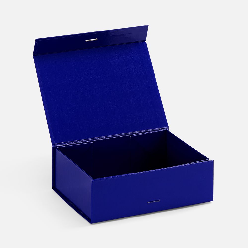 Коробка из переплетного картона с лайнером, ламинированым полуглянцевой текстурной пленкой устойчив к царапинам. Крышка на двух магнитах дополнительно фиксируется репсовой лентой.Толщина картона 2 мм.