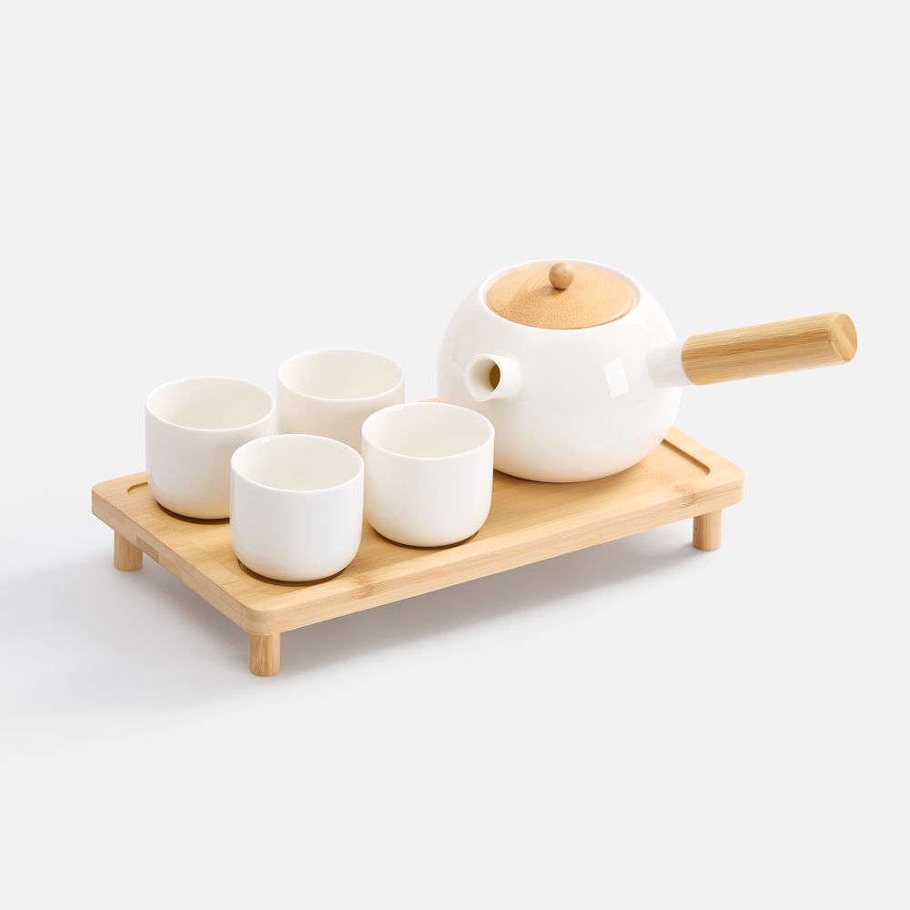 • чайник, чашки - фарфор; поднос, крышка и ручка у чайника - бамбук