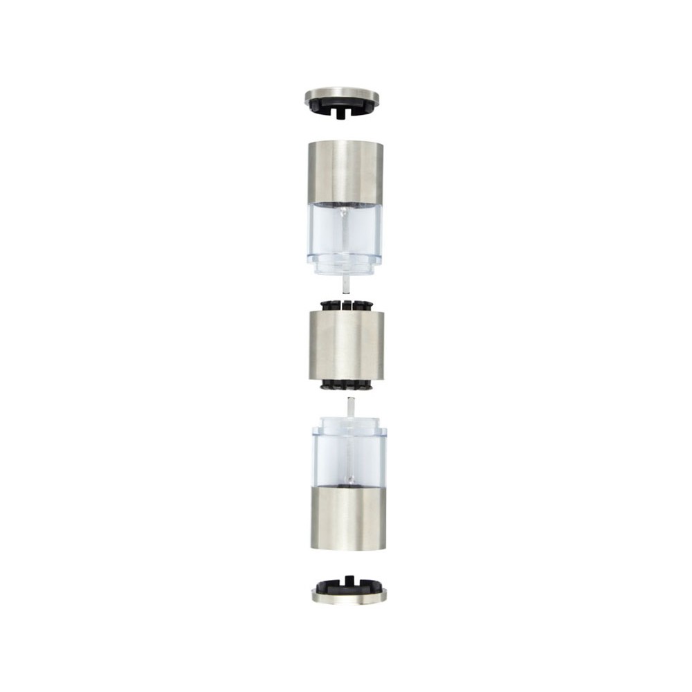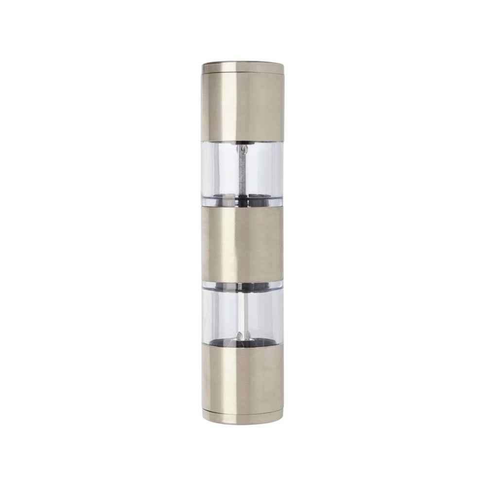 Двусторонняя мельница с одной стороной для соли, а второй для перца. Перец и соль в комплект не входят. Нержавеющая сталь, пластик PS.