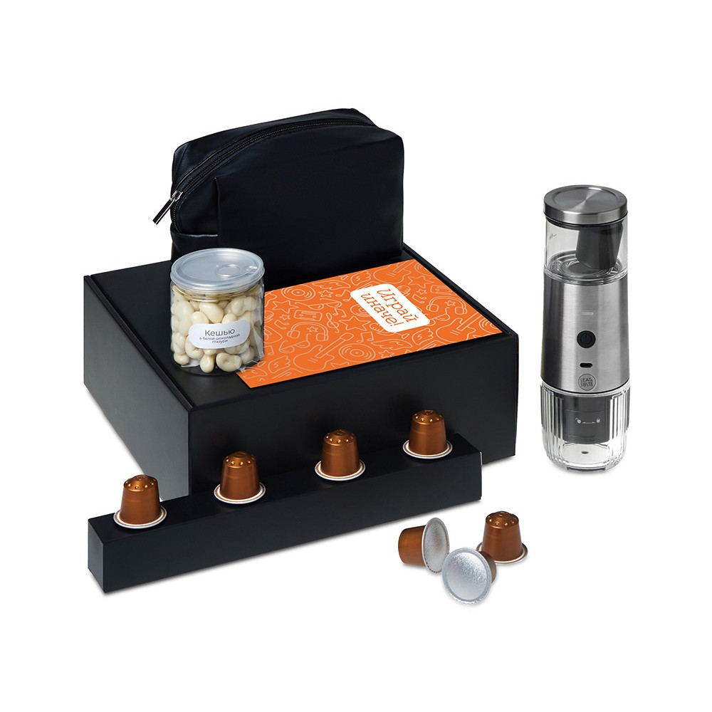 Набор Re:y. Boost о бодрости, энергии и маленьких ритуалах, которые можно взять с собой. Портативная кофемашина и кофе в капсулах позволяют приготовить ароматный напиток дома, в офисе или на прогулке. Кешью в глазури добавляет сладкую нотку, а косметичка позволяет взять любимые вещи с собой, куда бы вы ни отправились.. Этот набор превращает привычный утренний ритуал в момент бодрости и комфорта, где бы вы ни были.
