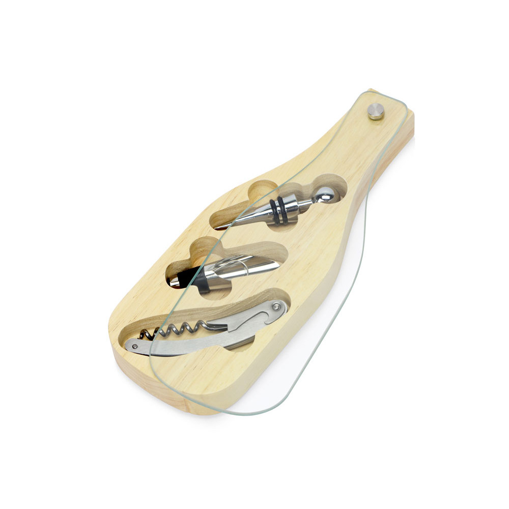 Деревянная часть футляра имеет три вырезанные ниши под каждое из приспособлений для вина, дополненные выемками под пальцы для удобного извлечения.