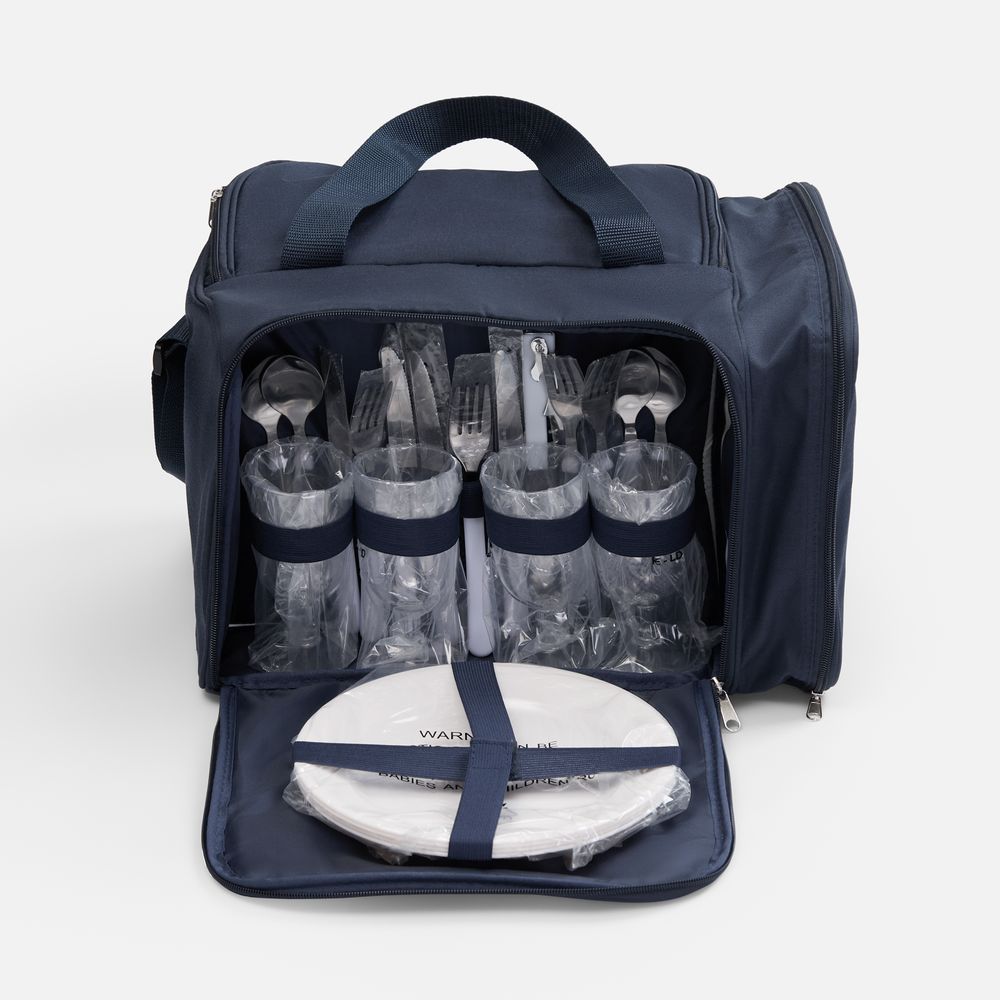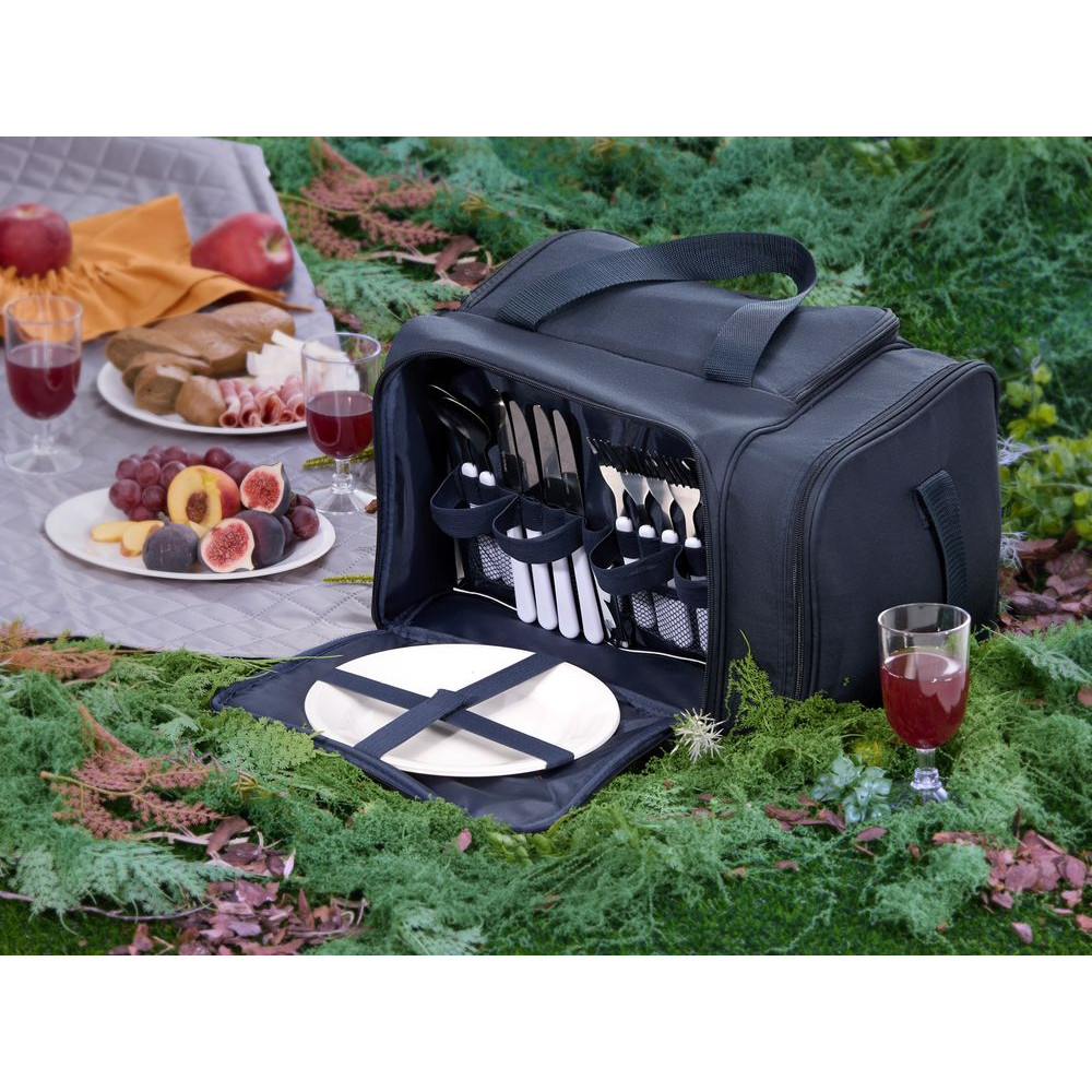 - термосумка - полиэстер, плотность 230 г/м², PEVA; тарелки и бокалы - полистирол; приборы - нержавеющая сталь, пластик