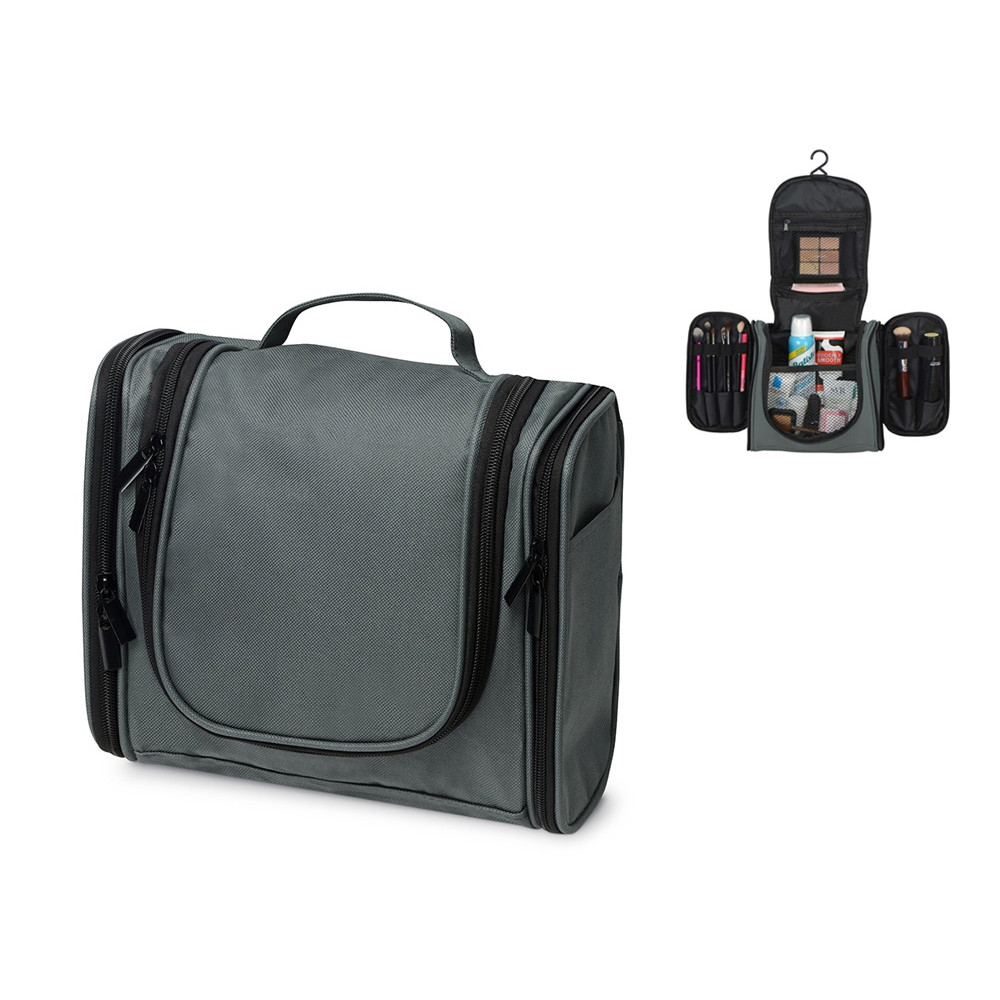 Несессер для путешествий. Эргономичный и вместительный, имеет внутренние и внешние карманы и большое отделение внутри. Оснащён ручкой для переноски и крючком для подвешивания. Нейтральный лаконичный дизайн позволяет преподнести несессер как мужчине, так и женщине;