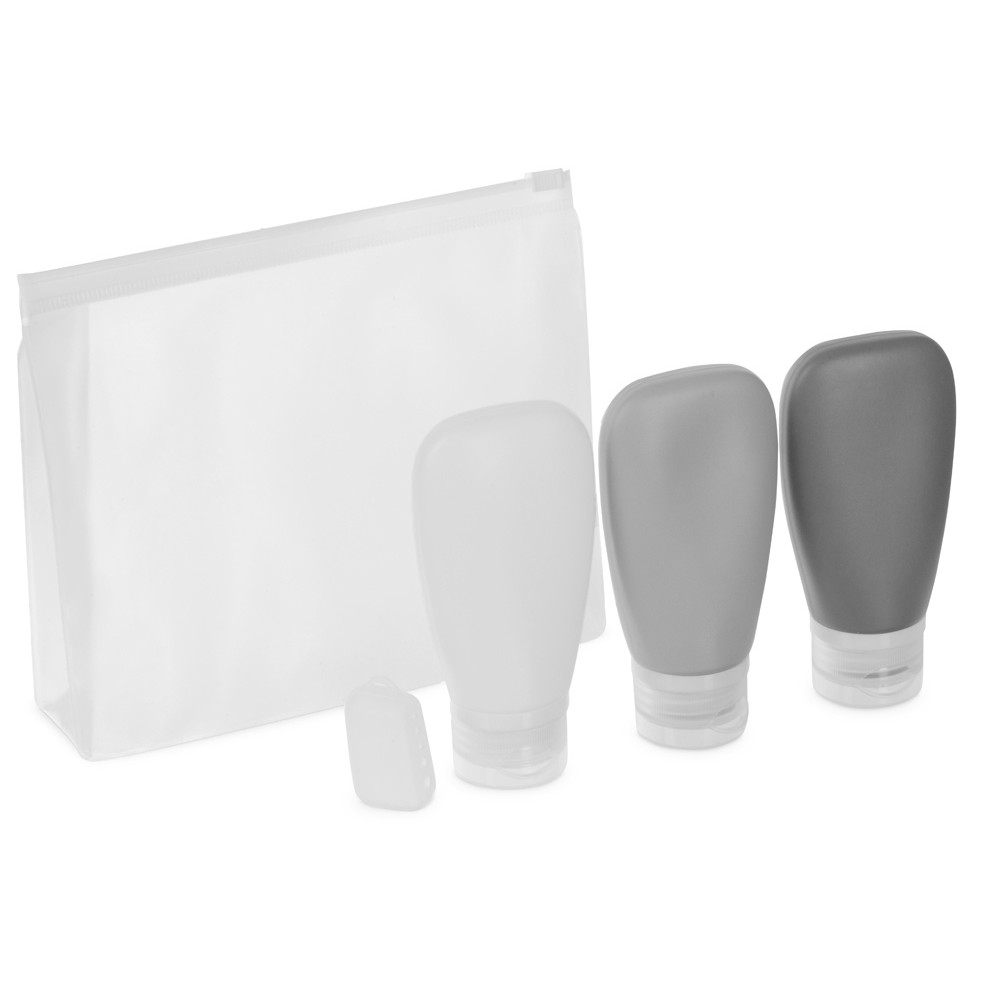 - силиконовые флакончики упакованы в полупрозрачную косметичку из EVA;