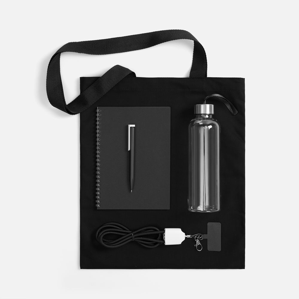 - сумка - хлопок, 240 г/м²; ручки - полиэстер; кабель-ланьярд - нейлон, пластик; металл; бутылка - пластик, пищевой; крышка - металл, пластик; блокнот - бумага, картон; ручка - пластик