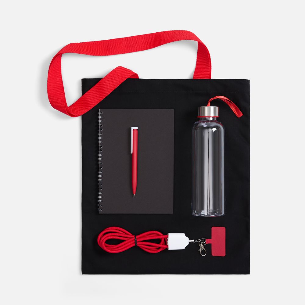 - сумка - хлопок, 240 г/м²; ручки - полиэстер; кабель-ланьярд - нейлон, пластик; металл; бутылка - пластик, пищевой; крышка - металл, пластик; блокнот - бумага, картон; ручка - пластик