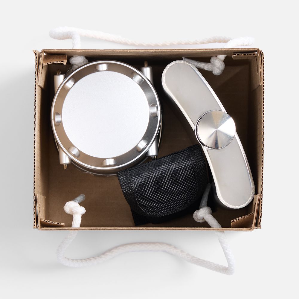 - мультитул - нержавеющая сталь; алюминий; фляжка - нержавеющая сталь, 304; фонарь - АБС-пластик; коробка - микрогофрокартон