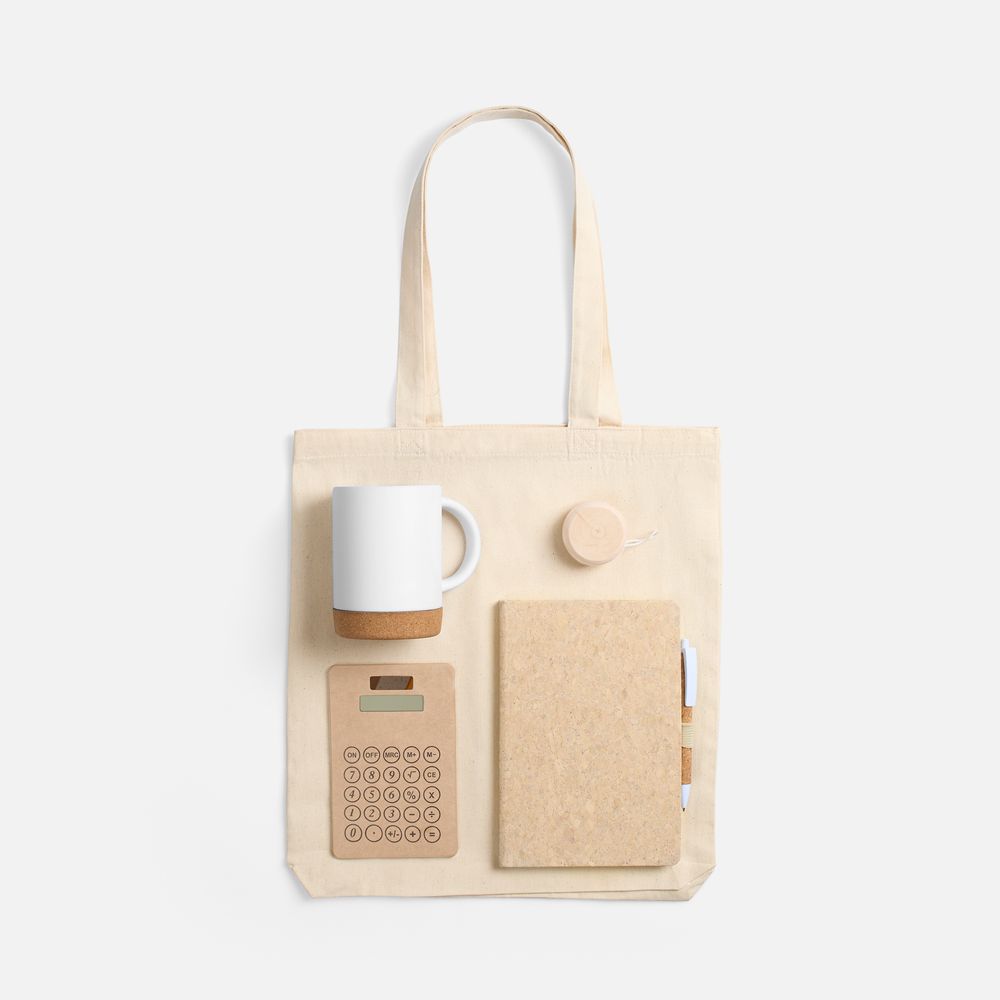 - блокнот - пробка; кружка - каменная керамика, подставка - пробка; калькулятор - картон; сумка - хлопок 100%, плотность 210 г/м²; саржа; игрушка-антистресс - дерево; ручка - пластик, пробка