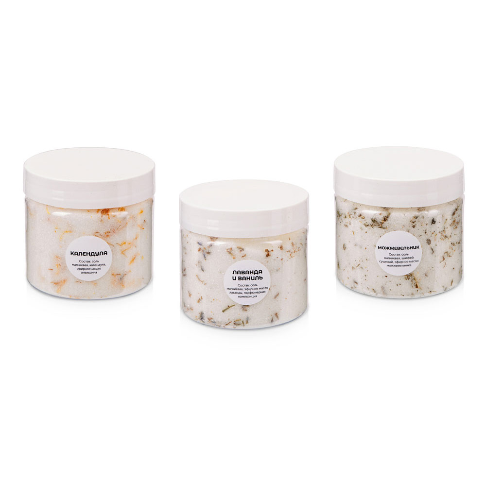 В набор входит три банки соли с ароматами календулы, можжевельника и лаванды с ванилью.