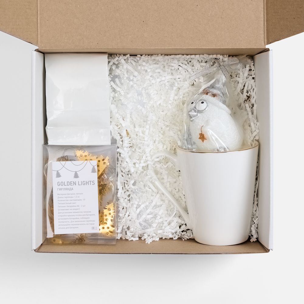 - кружка - костяной фарфор; гирлянда - пластик, металл; свеча - парафин; ежедневник - искусственная кожа; ручка - металл