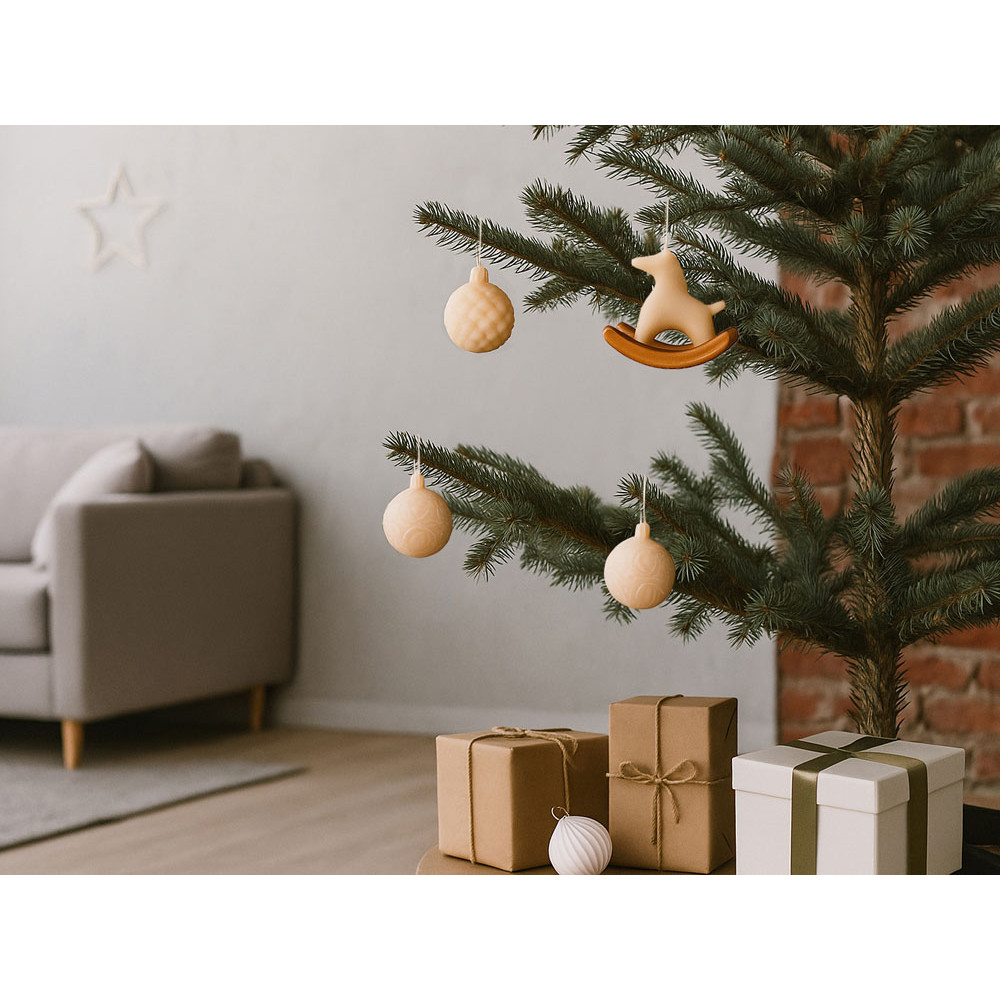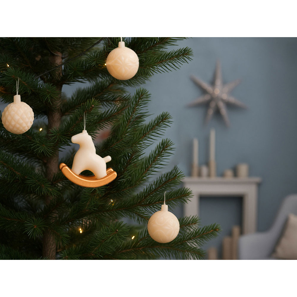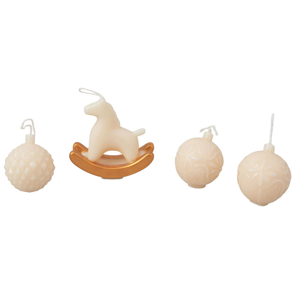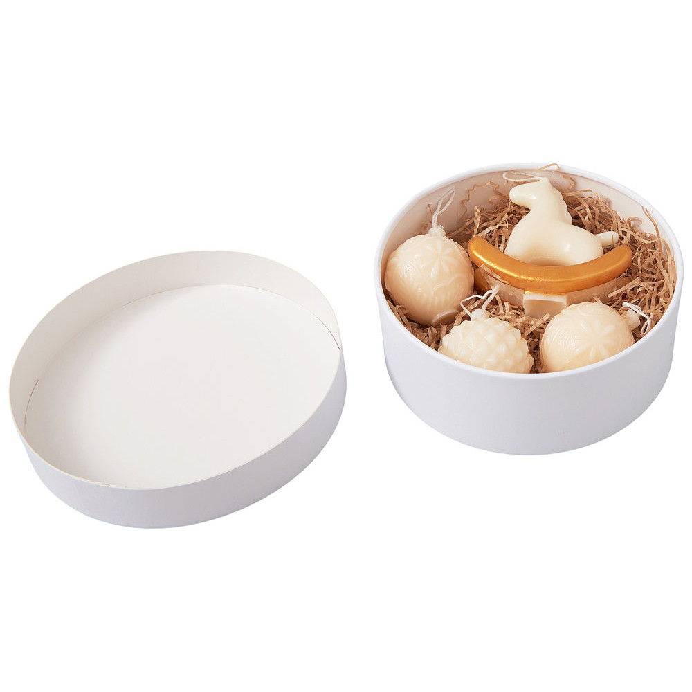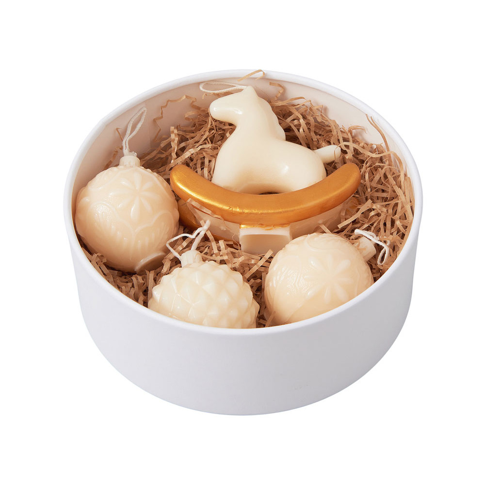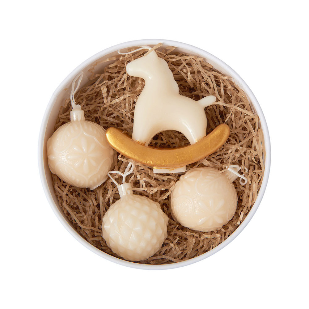 Набор свечей в подарочной коробке Noel - элегантный штрих к праздничному декору. В круглой коробке с крышкой — три свечи в форме новогодних шаров и одна в виде лошадки, выполненные из утончённой смеси кокосового, соевого воска и парафина.