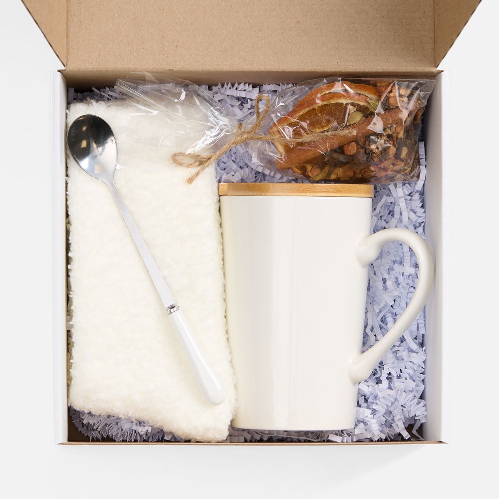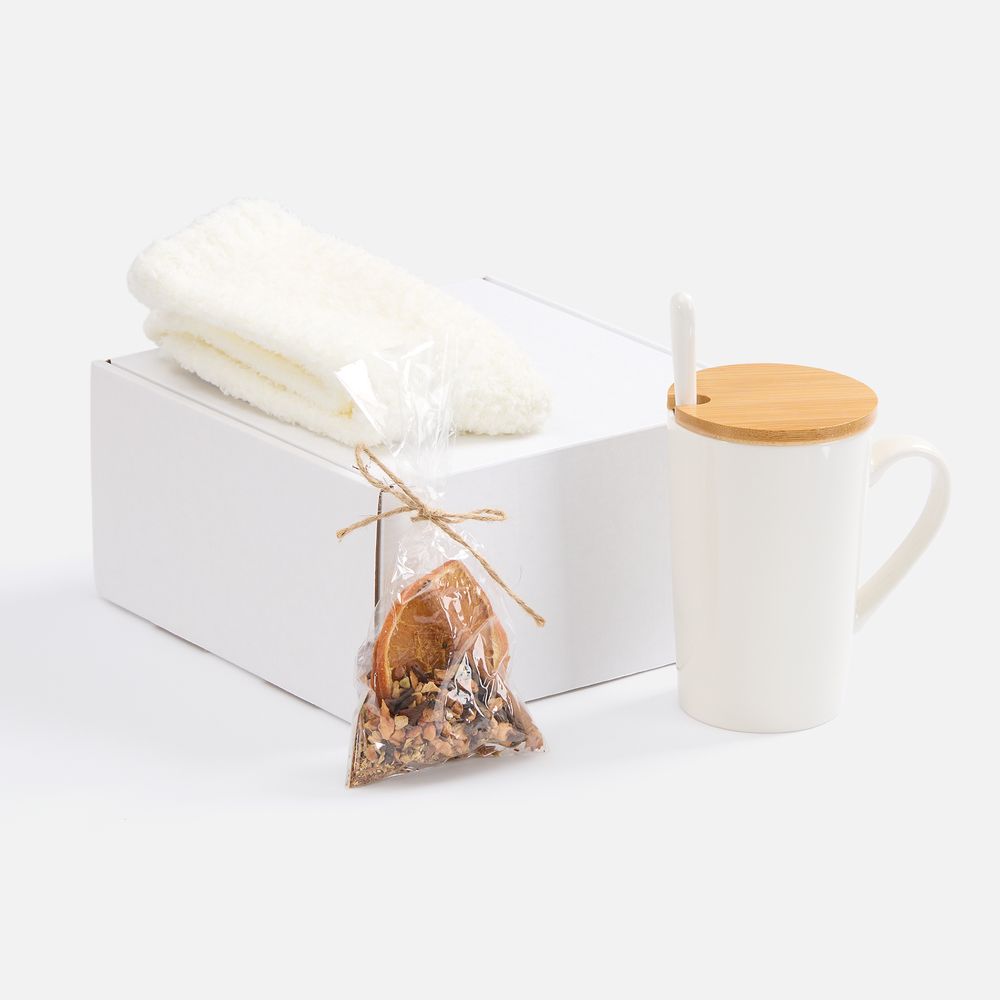 - кружка - фарфор, крышка - бамбук; ложка - нержавеющая сталь; носки - полиэстер 100%; коробка - микрогофрокартон, Т-23Е