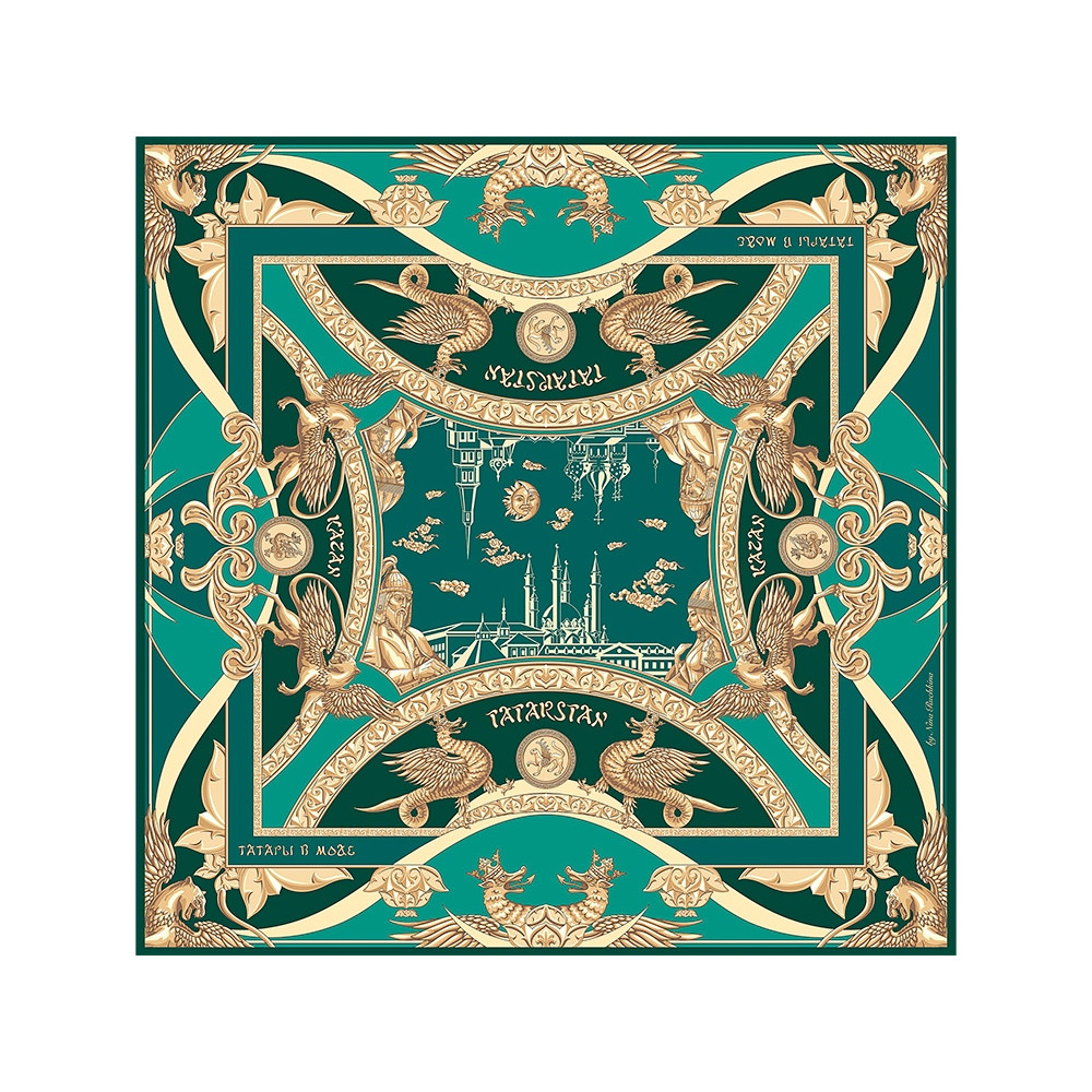 Крылатый барс как — Бог плодородия и покровитель детей, изображение которого присутствует на государственном гербе Республики Татарстан идеально вписывается в общую композицию. На платке барс изображен в виде золотой скульптуры, как и Зилант, это придает платку сказочности, волшебства и царственности.
