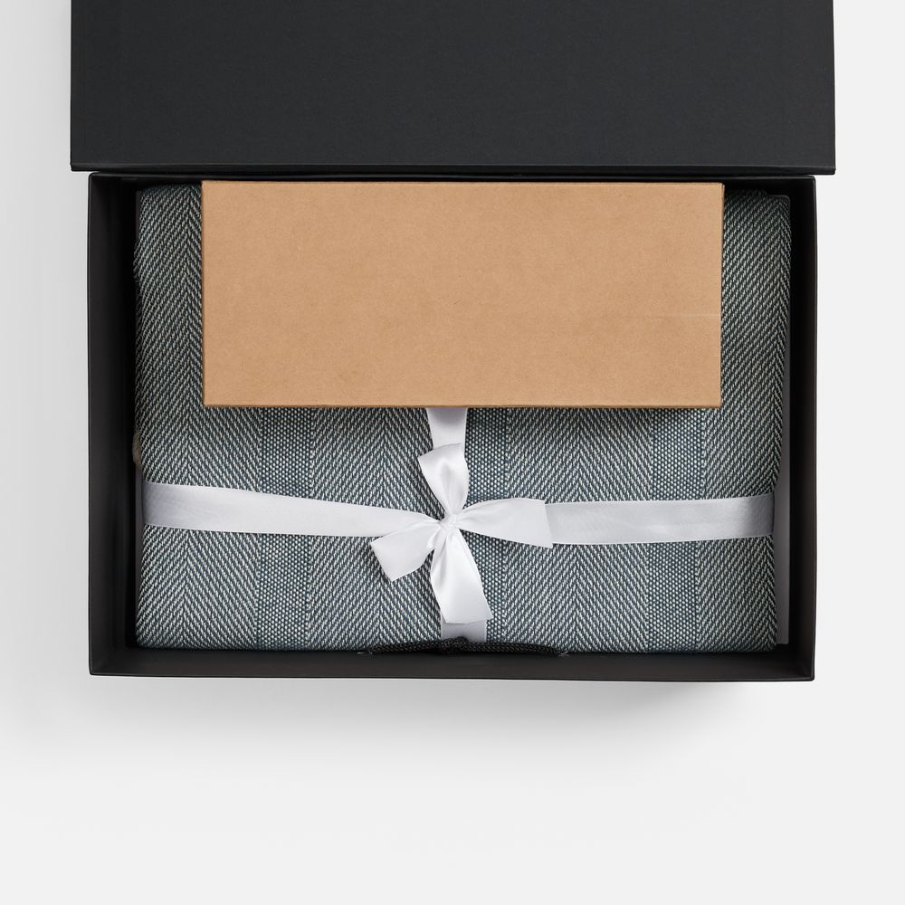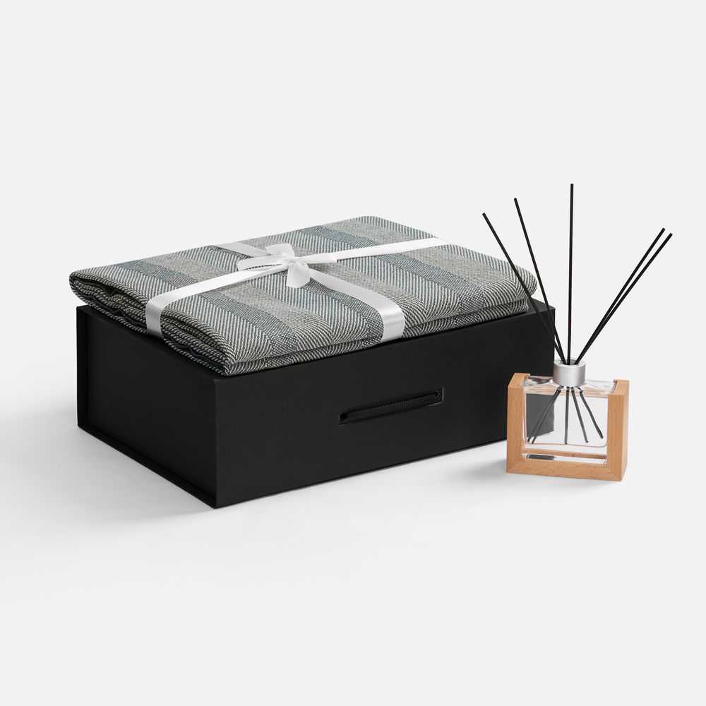 - флакон - стекло, палочки из файбера; подставка для флакона - дерево; плед - хлопок 95%, полиэстер 5%, плотность 300 г/м²; коробка - переплетный картон, бумага Malmero