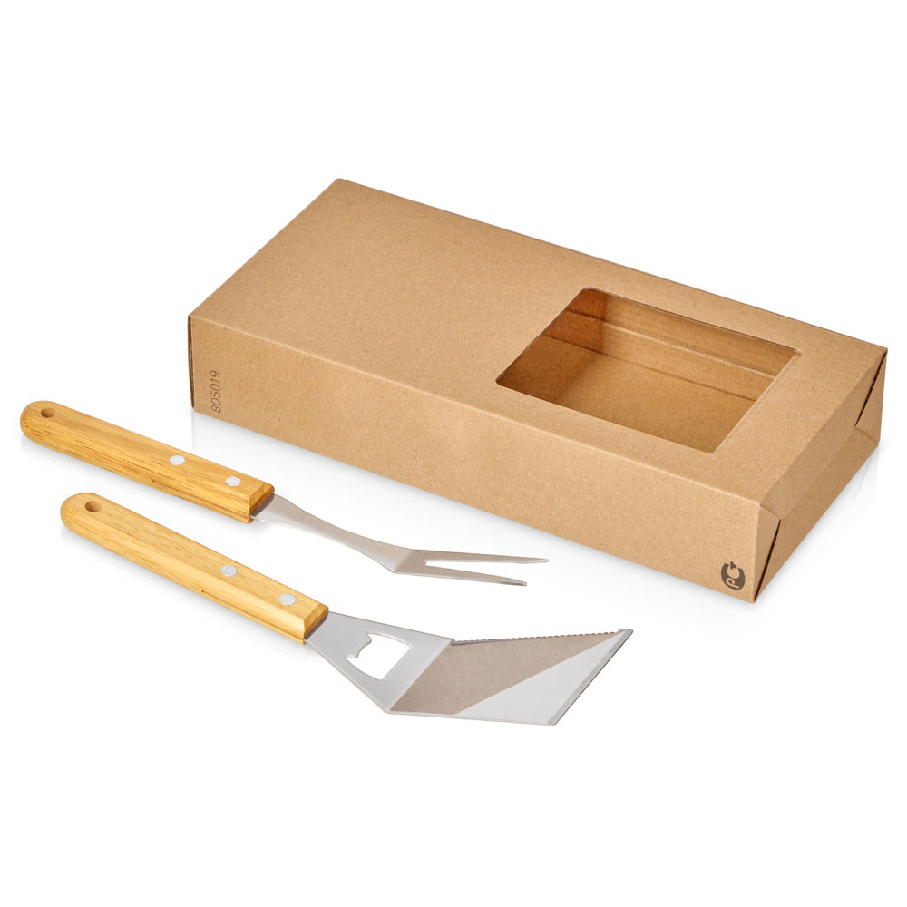 Приборы выполнены из нержавеющей стали, ручки — из дерева: не только не дадут обжечь руки при готовке, но и могут стать дополнительным полем для нанесения.
