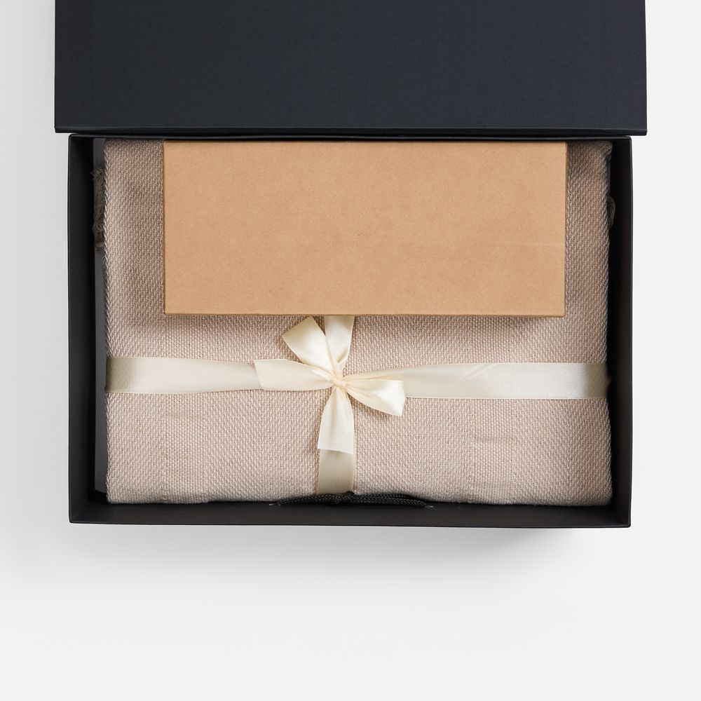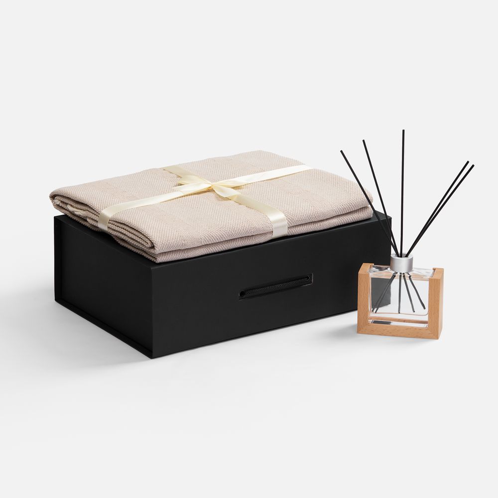- флакон - стекло, палочки из файбера; подставка для флакона - дерево; плед - хлопок 95%, полиэстер 5%, плотность 300 г/м²; коробка - переплетный картон, бумага Malmero