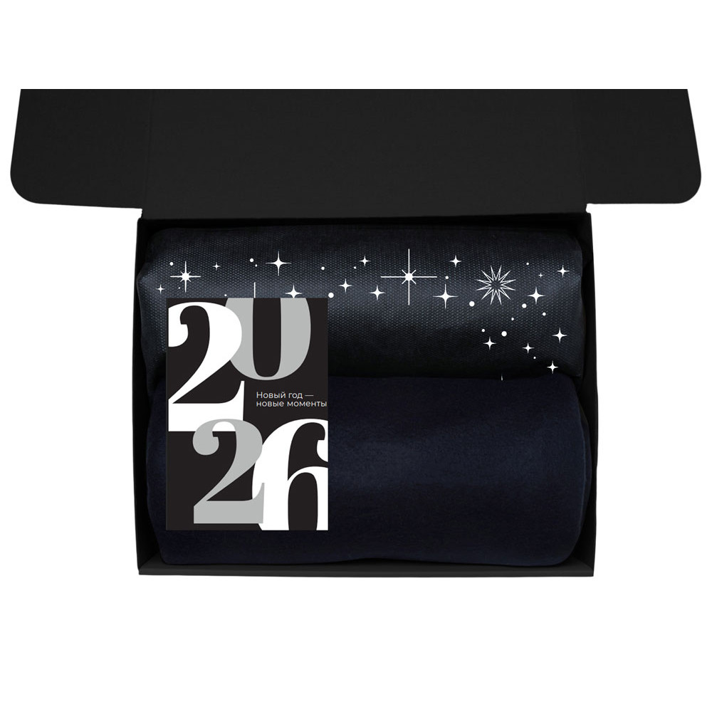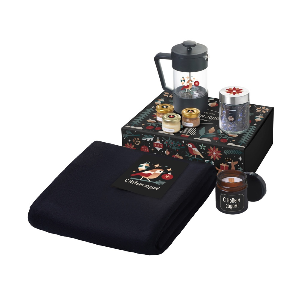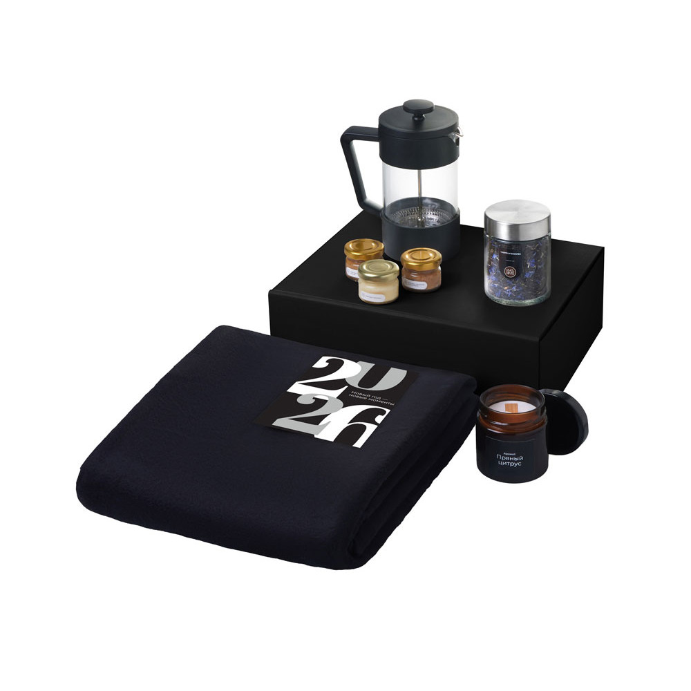 Подарочный набор c пледом, френчпрессом, чаем и медом, черный