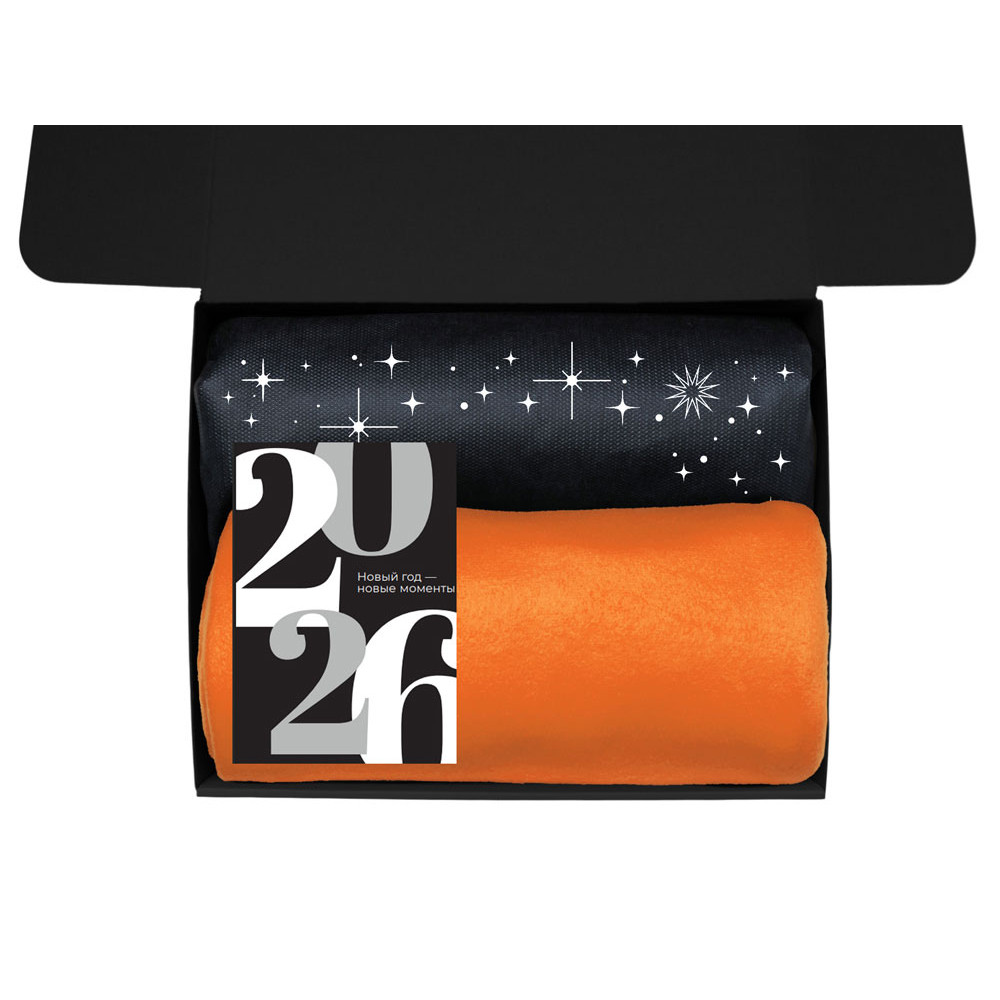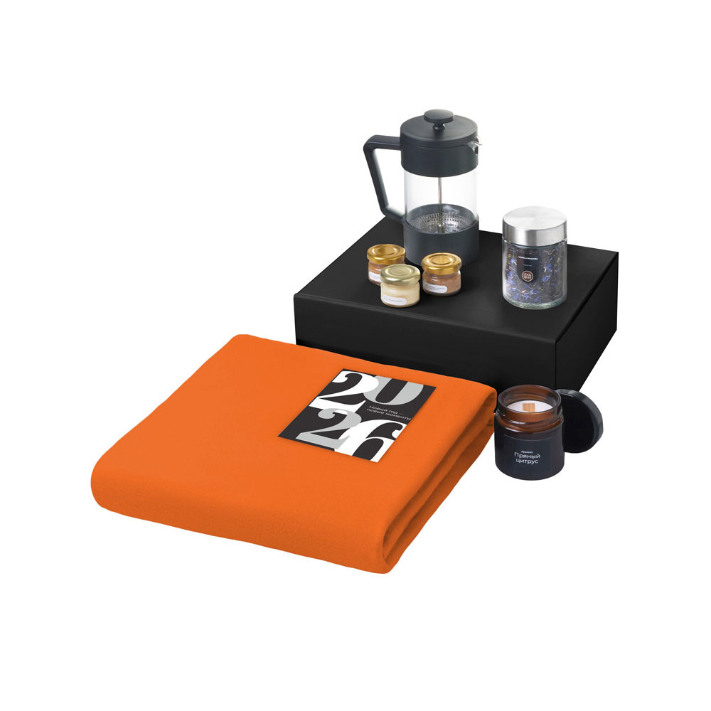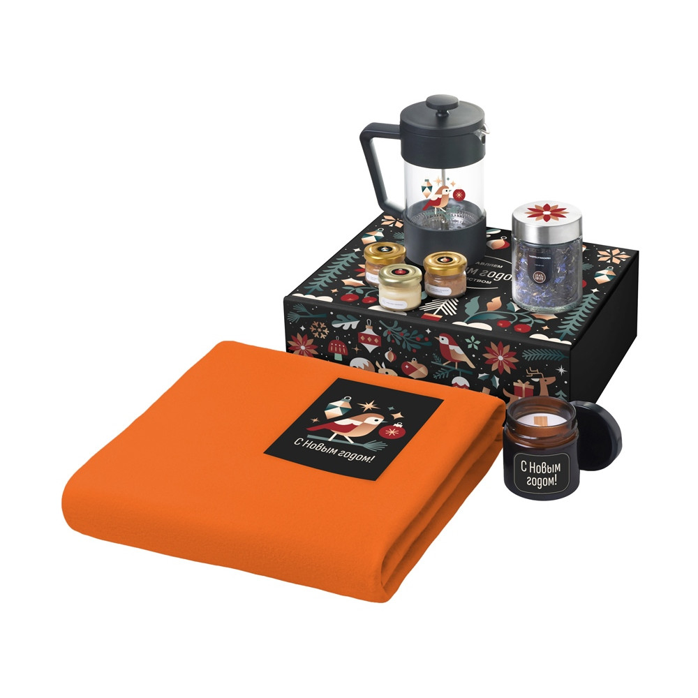 Подарочный набор c пледом, френчпрессом, чаем и медом, оранжевый