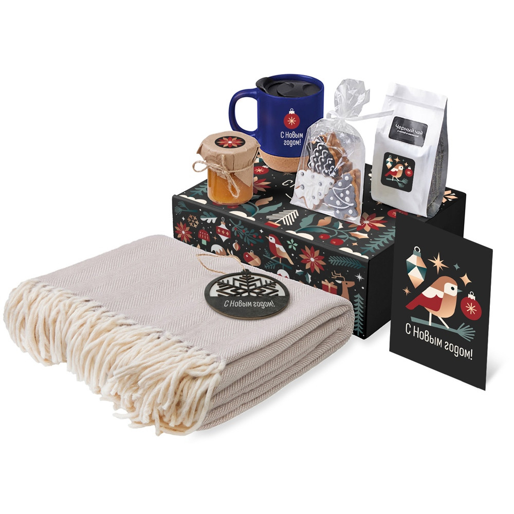 Подарочный набор c пледом, кружкой и вареньем, синий
