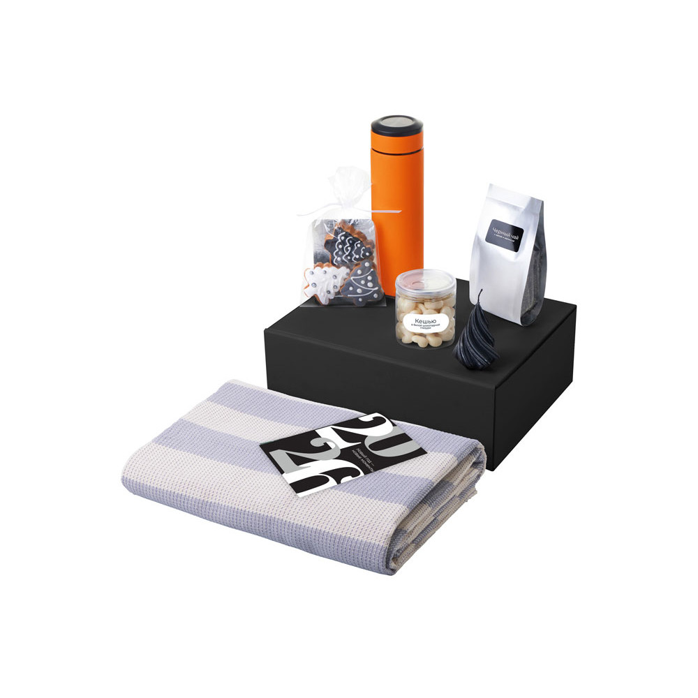 Подарочный набор c пледом, термосом, свечой и миндалем, оранжевый
