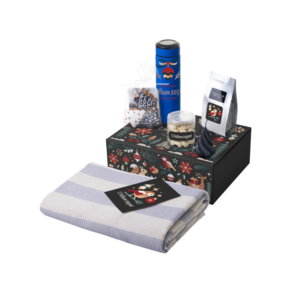 - Материал товара плед - 100% хлопок, мешок - нетканый материал (спанбонд), термос - нержавеющая cталь с покрытием soft-touch, открытка - бумага