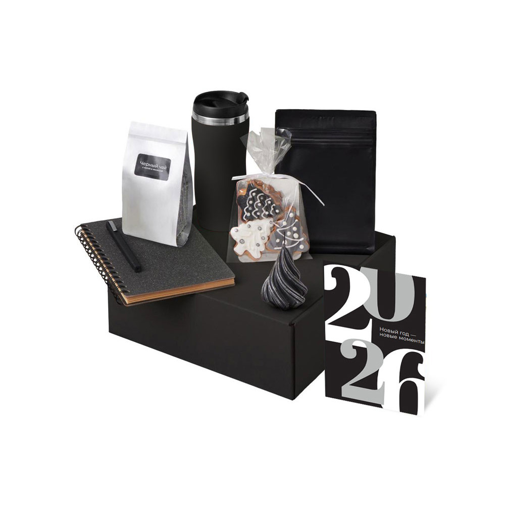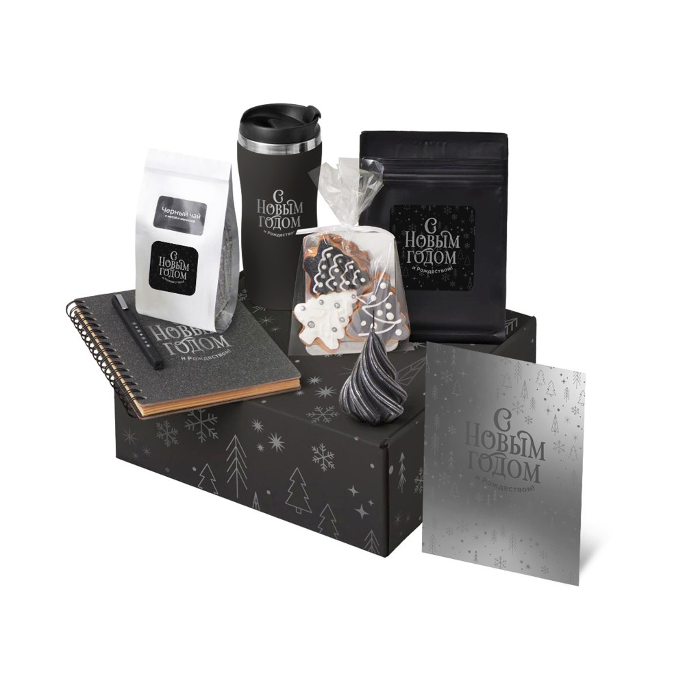 Подарочный набор c термокружкой, чаем, кофе и блокнотом, черный