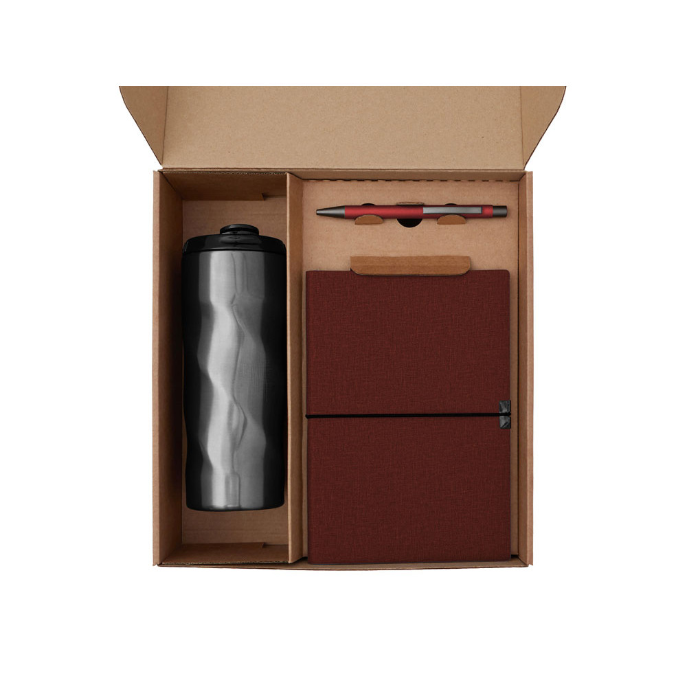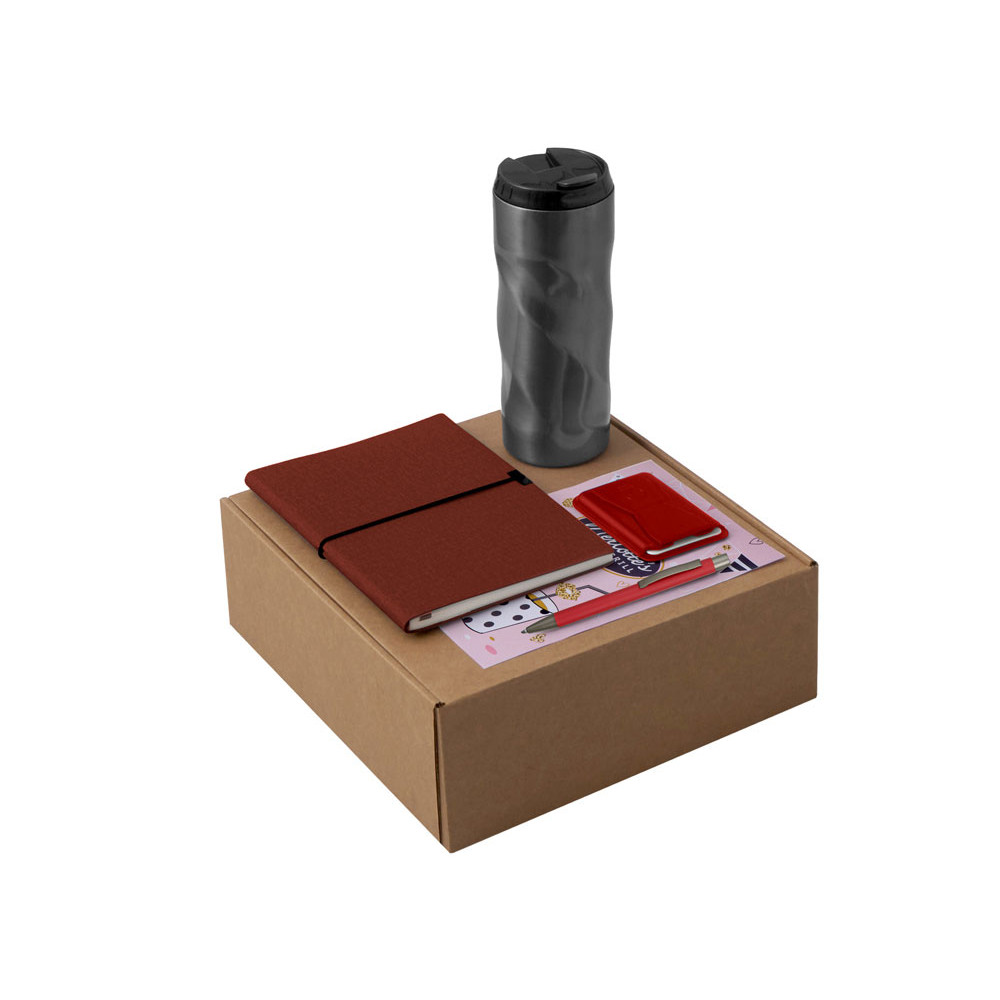- Материал товара блокнот- искусственная кожа, бумага, ручка - металл с поверхностью soft-touch, термокружка - кружка- нержавеющая сталь, крышка- пластик, картхолдер - переработанный полиуретан, открытка - бумага, коробка- картон