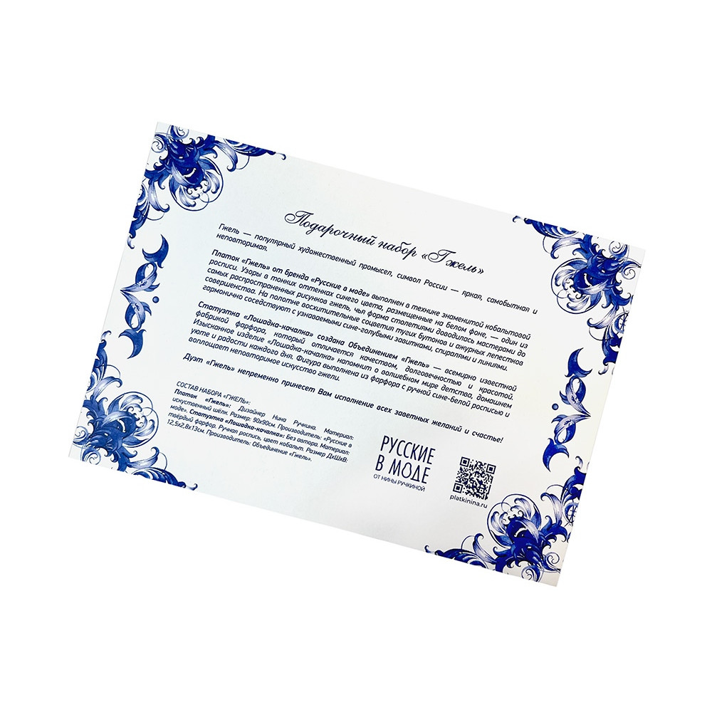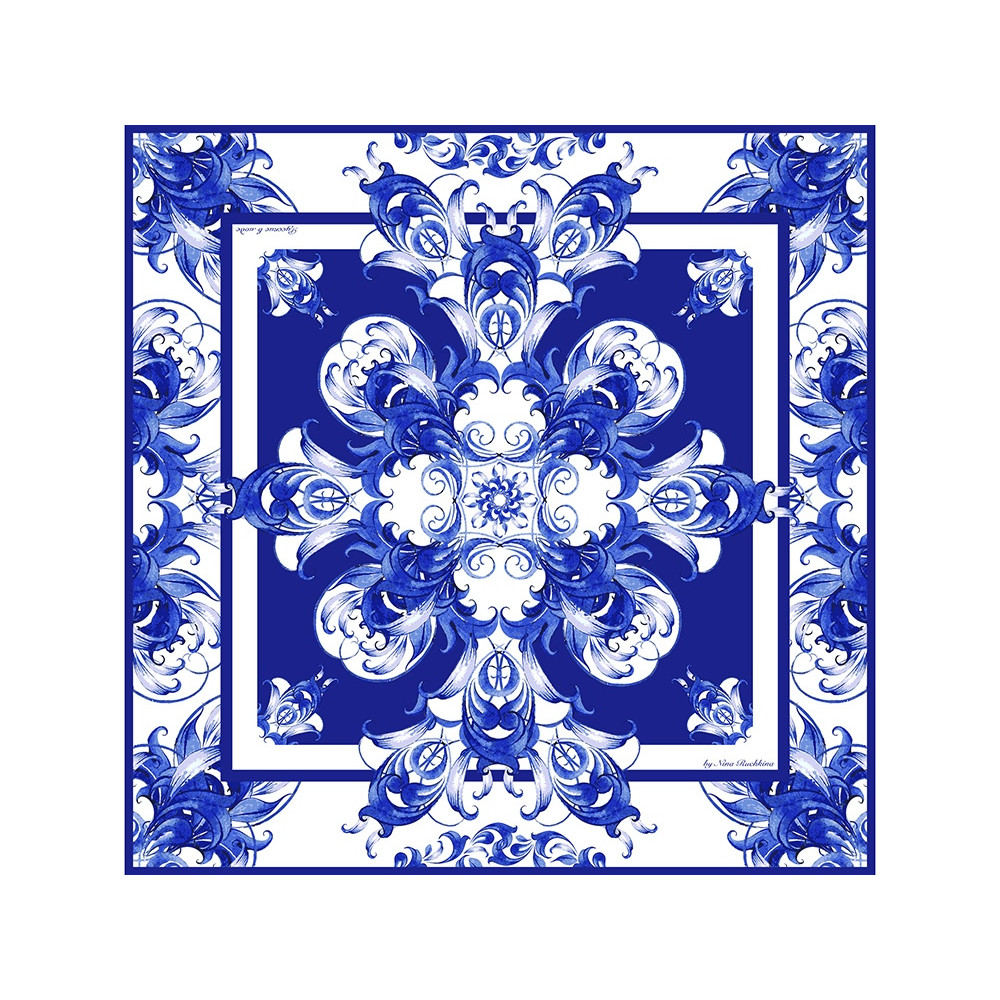 Платок Гжель от бренда Русские в моде выполнен в технике знаменитой кобальтовой росписи. Узоры в тонких оттенках синего цвета, размещенные на белом фоне, — один из самых распространенных рисунков гжель, чья форма столетиями доводилась мастерами до совершенства. На полотне восхитительные соцветия тугих бутонов и ажурных лепестков гармонично соседствуют с узнаваемыми сине-голубыми завитками, спиралями и линиями.