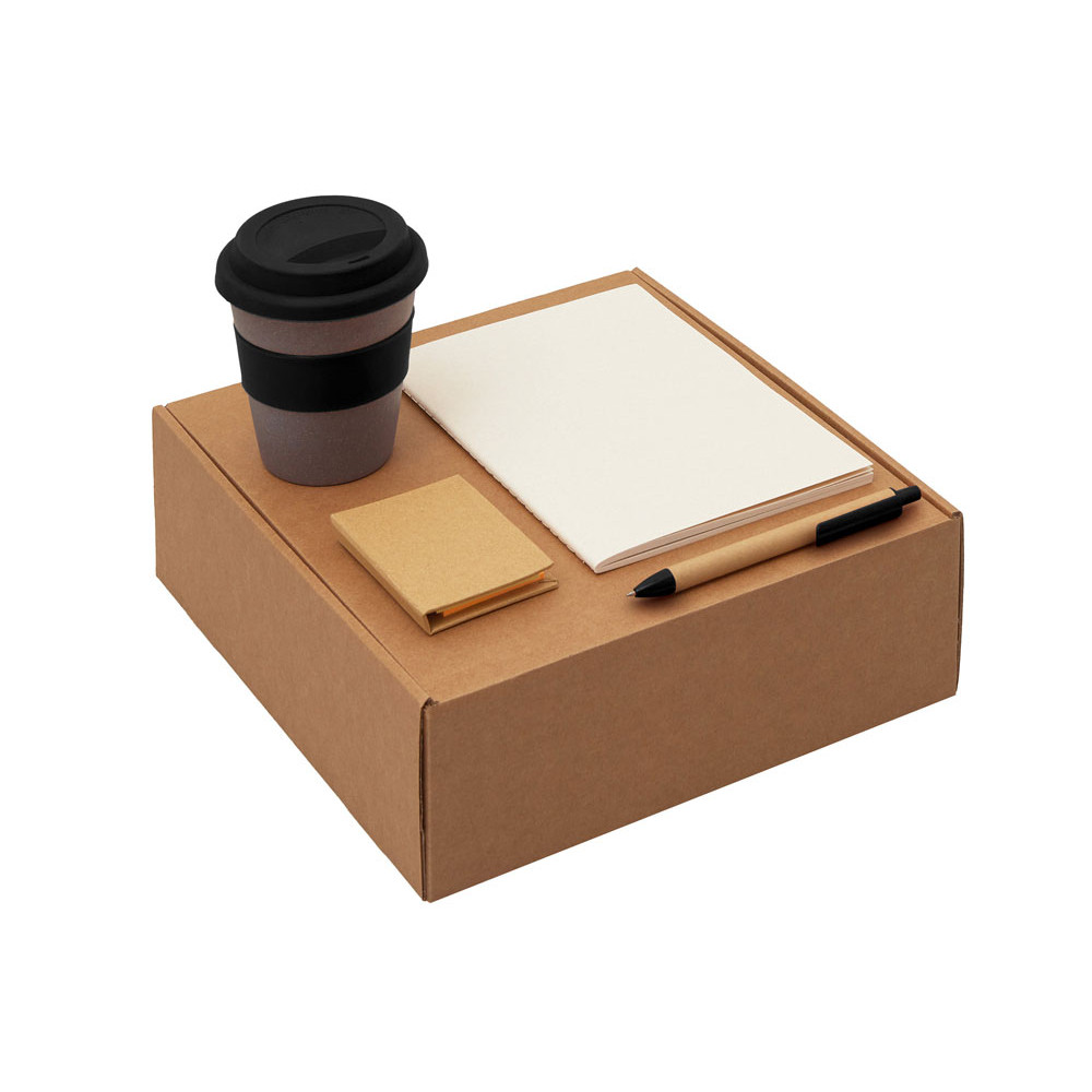 - Материал товара блокнот- бумага из переработанных тетра-паков, ручка- картон,пластик, стакан- 50% бамбуковое волокно, 50% полипропилен, коробка- картон