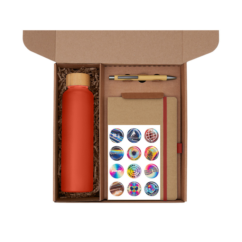 - Материал товара бутылка - боросиликатное стекло, бамбук, блокнот - картон, бумага, ручка - бамбук, пластик, подставка - бамбук, наполнитель - бумага, стикеры - смола, коробка - картон