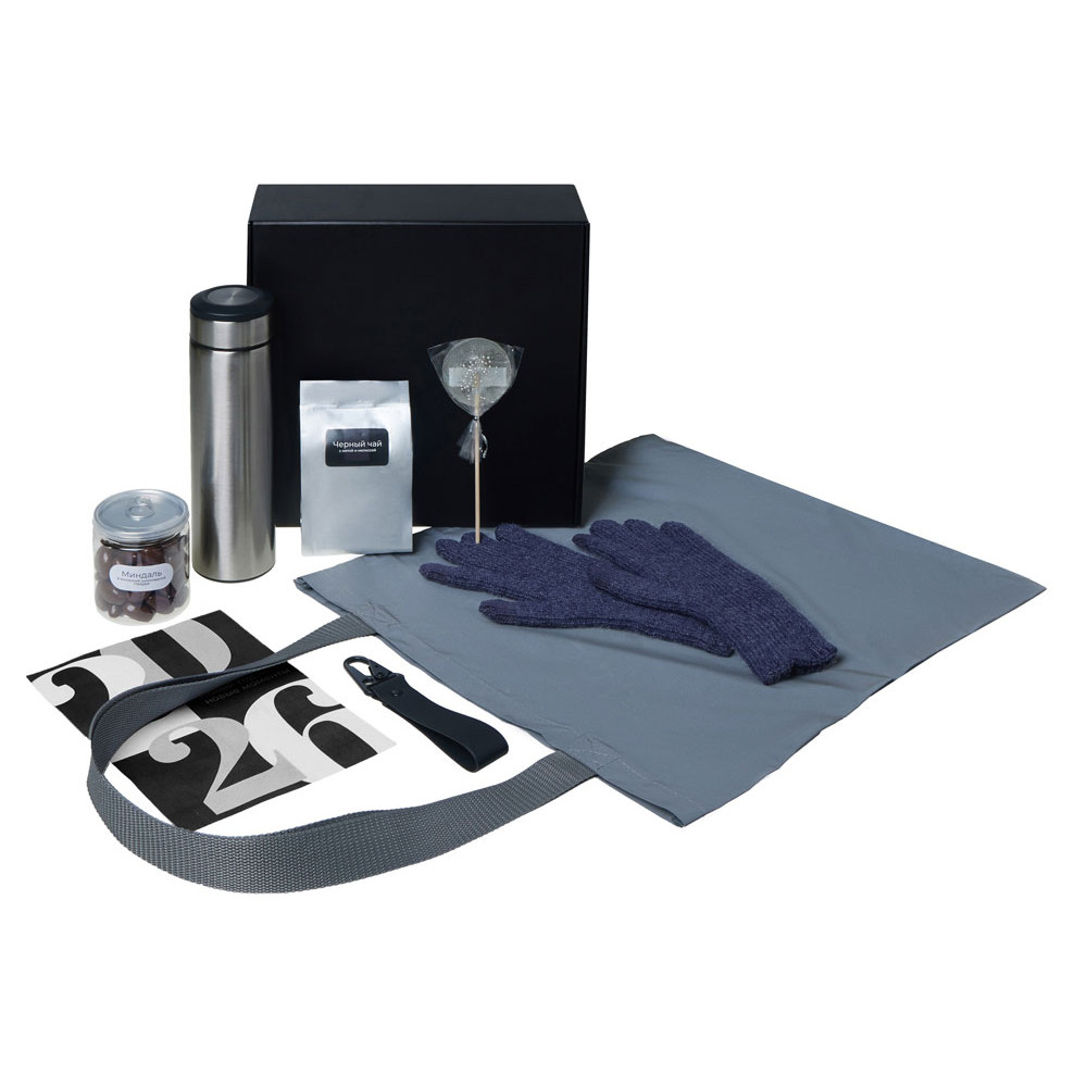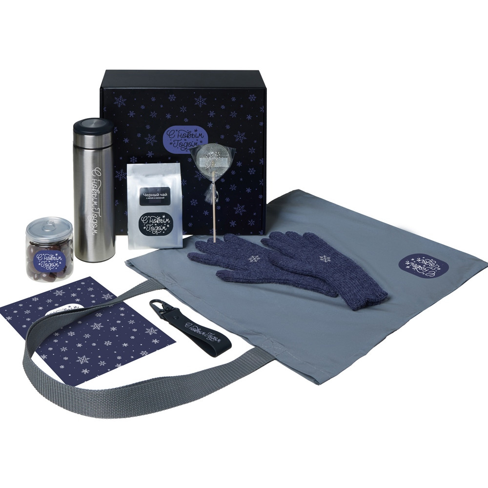 Подарочный набор с перчатками, термосом и чаем, темно-синий