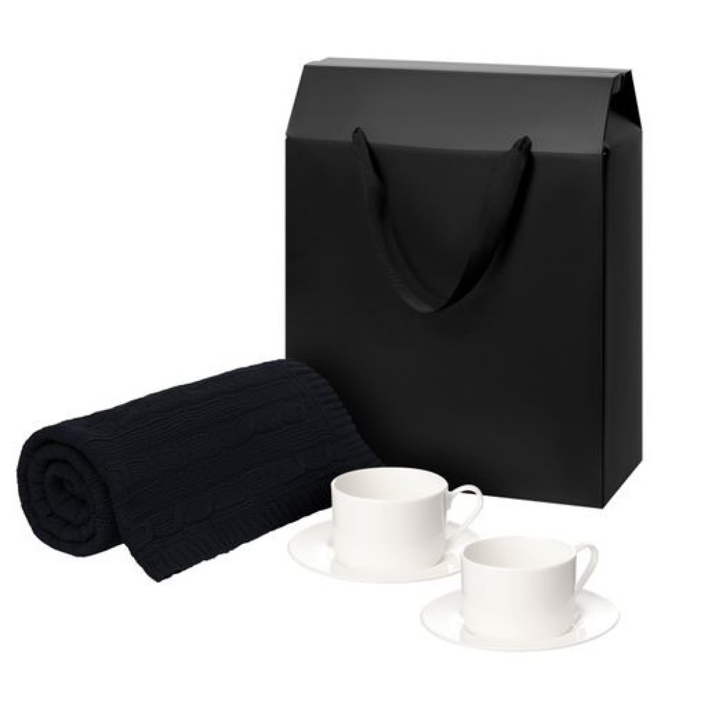 Подарочный набор Мокко (Mokko), Фадо (Fado), темно-синий в черной коробке-пакете (две чайных пары, плед)