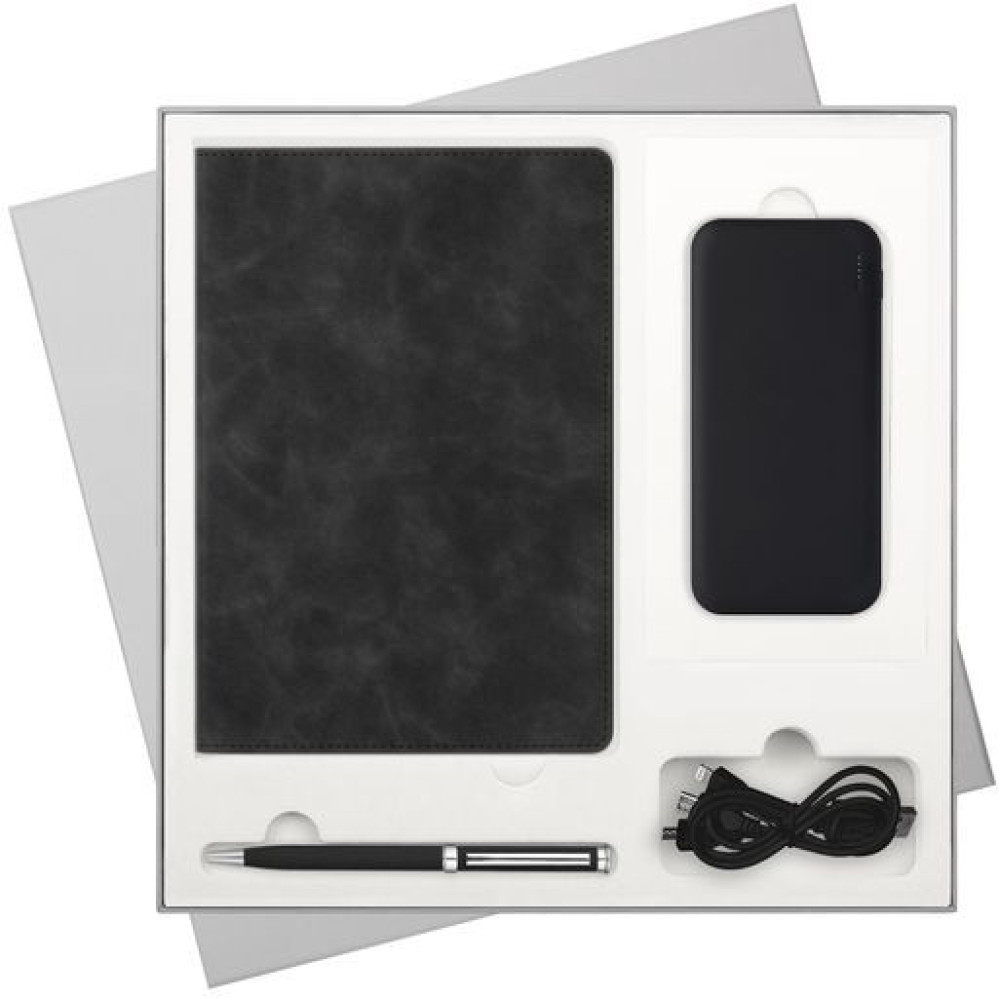 В комплекте: стильный ежедневник для планирования и любых записей, ручка для комфортного письма и внешний аккумулятор, который позволит оставаться на связи в любой ситуации.