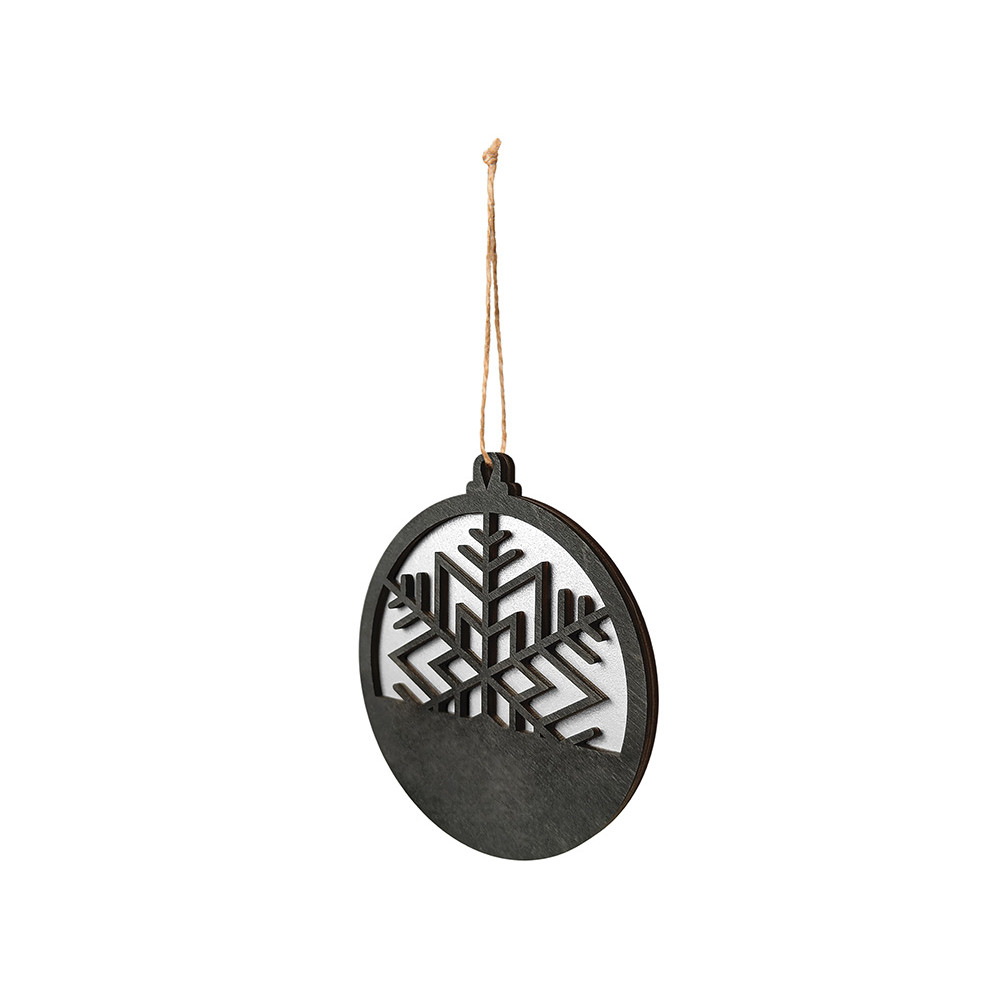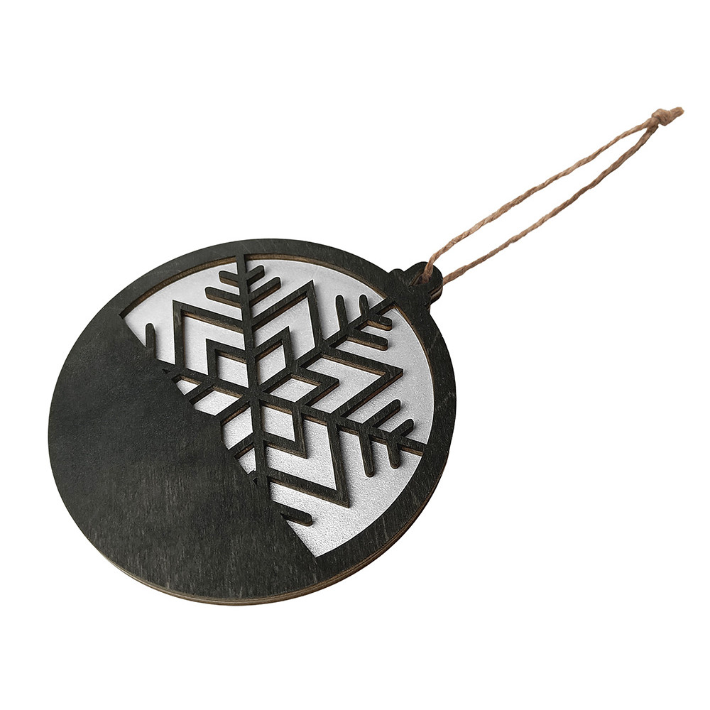 Стильная и минималистичная подвеска в форме снежинки выполнена из натуральной березовой фанеры. Сочетание черного и серебристого оттенков создаёт ощущение зимнего холода и утончённой простоты.