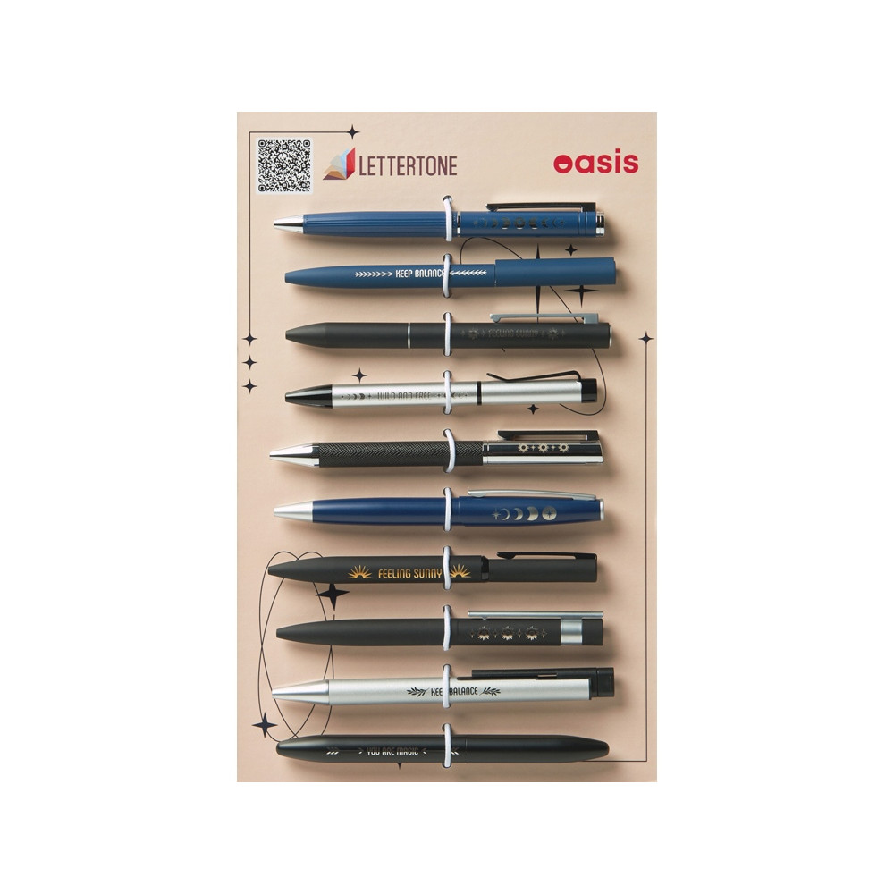 Сет металлических ручек Lettertone — это готовый презентационный комплект, включающий 10 стильных моделей ручек с примерами нанесения: гравировка и тампопечать.
