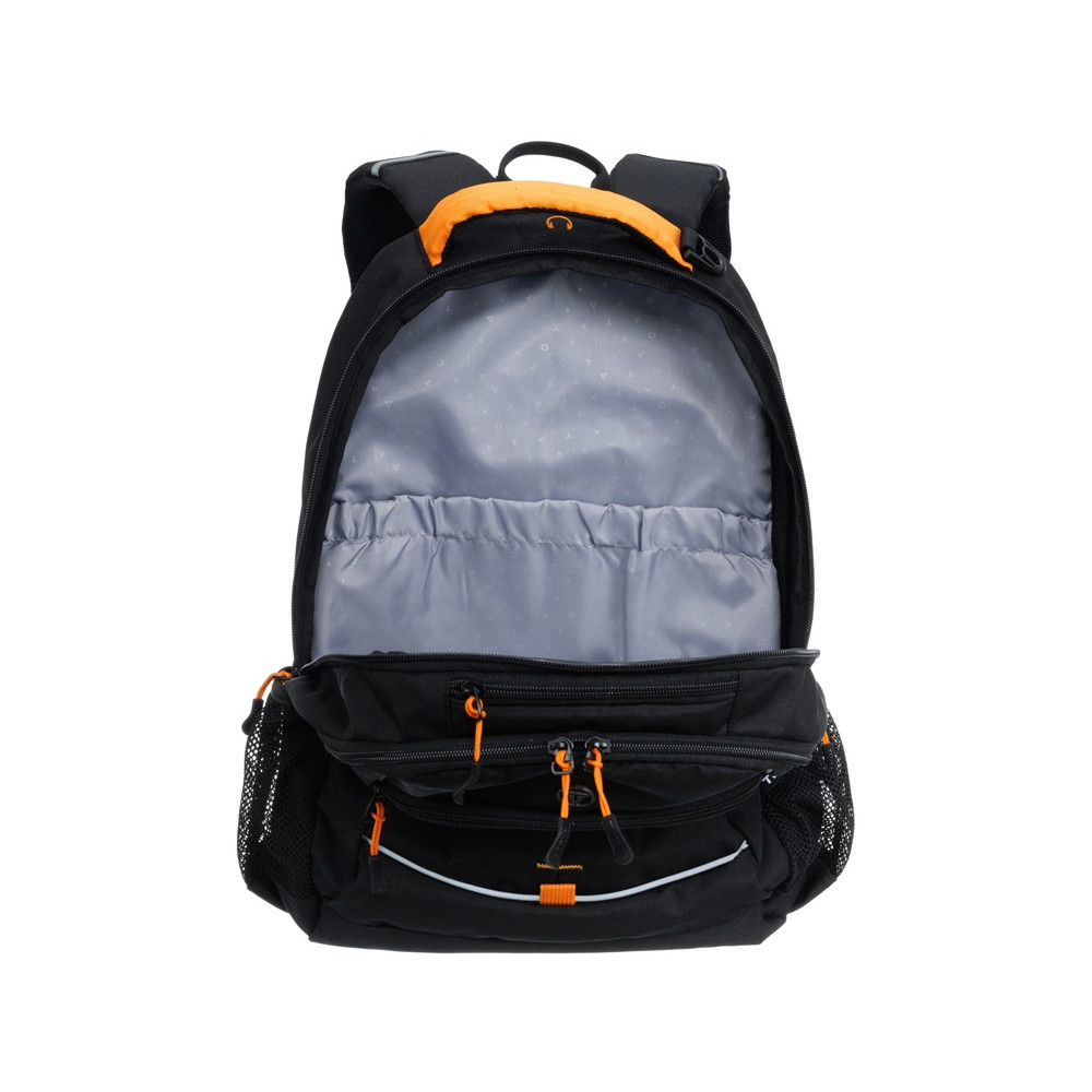 Два боковых кармана из эластичной сетки предназначены для хранения бутылок воды или зонта. Карман-органайзер и кольцо для ключей помогут вам упорядоченно разложить большое количество мелких предметов. Рюкзак имеет эргономичную ручку для более комфортного использования. Оригинальный дизайн и неповторимый стиль модели подчёркивают чёрный и оранжевый цвета.