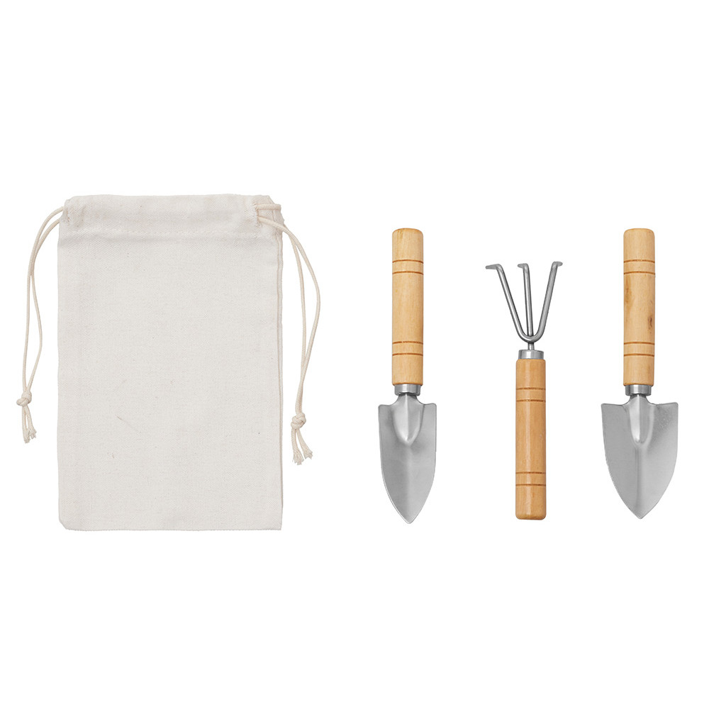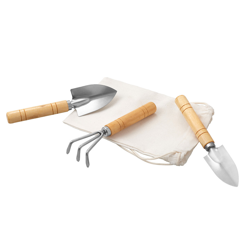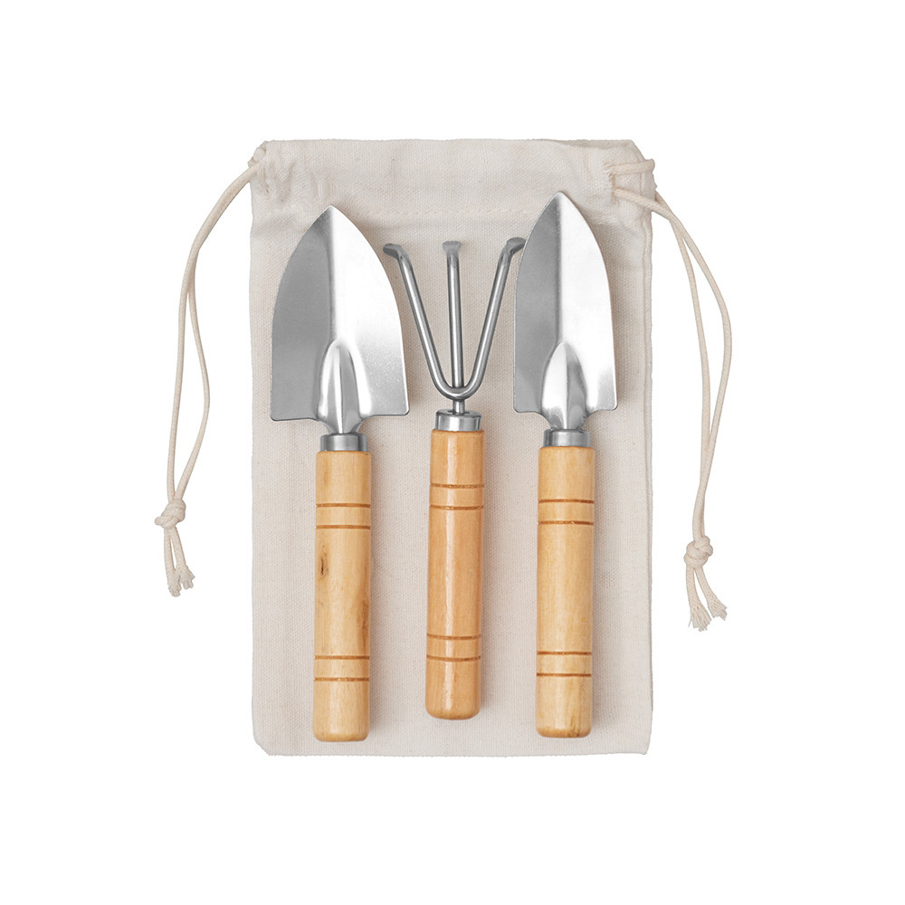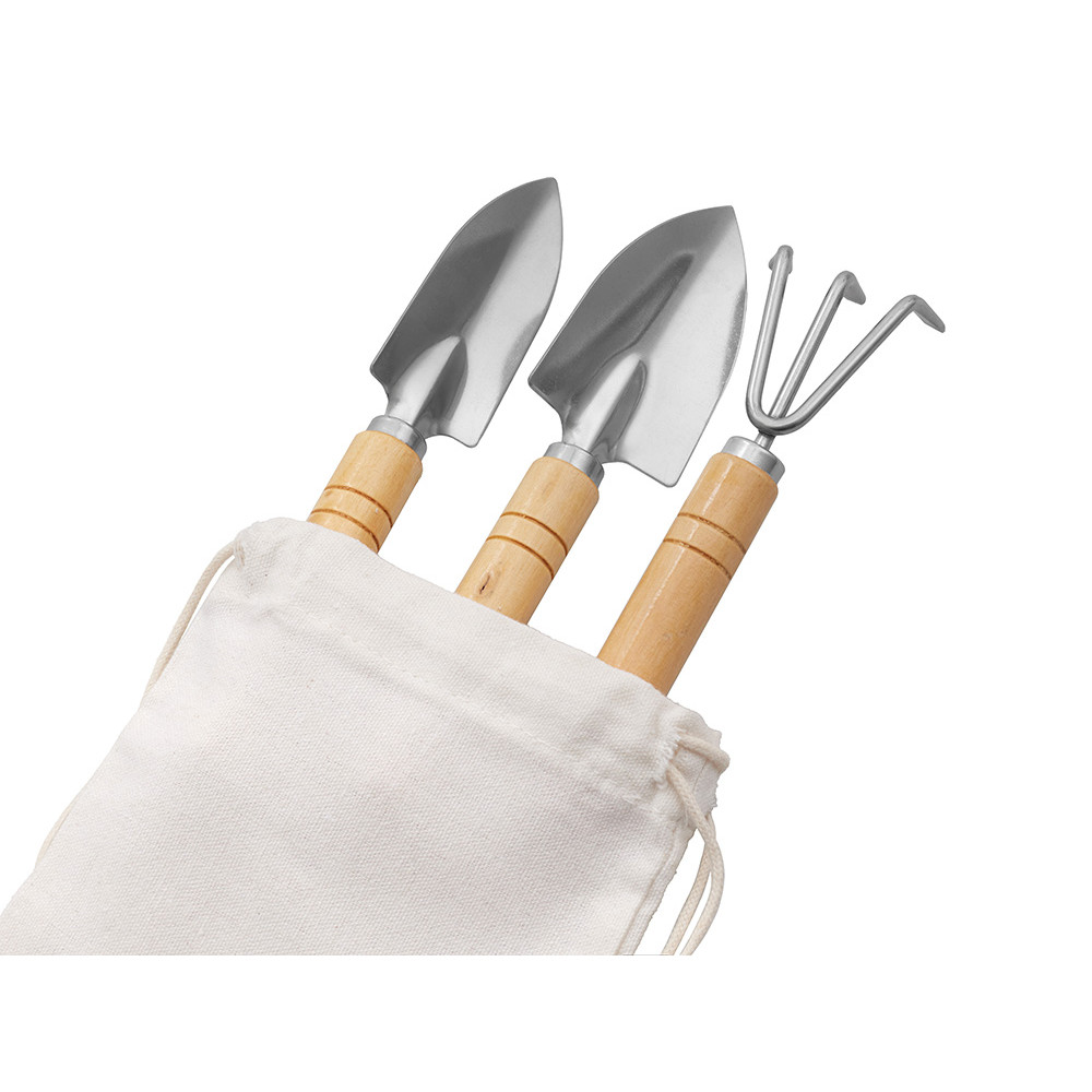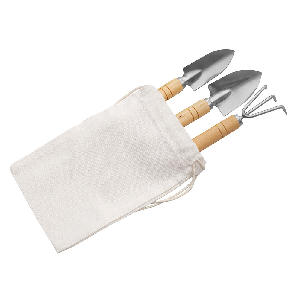 Садовый набор из 3 аксессуаров из нержавеющей стали с бамбуковыми ручками. Включает большую и малую лопатки и грабли. В комплект входит хлопковый мешочек.