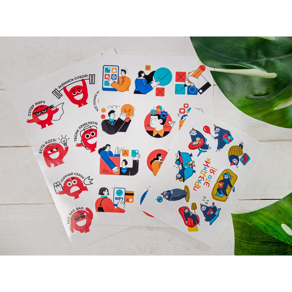 Лист с наклейками формата А5, которые можно использовать для украшения ноутбуков, планшетов, телефонов, дневников, скетчбуков и многого другого.