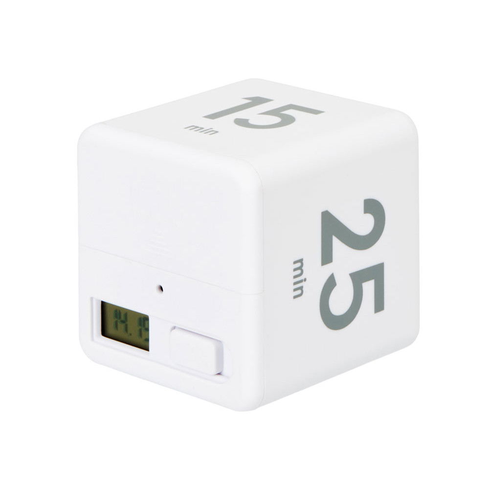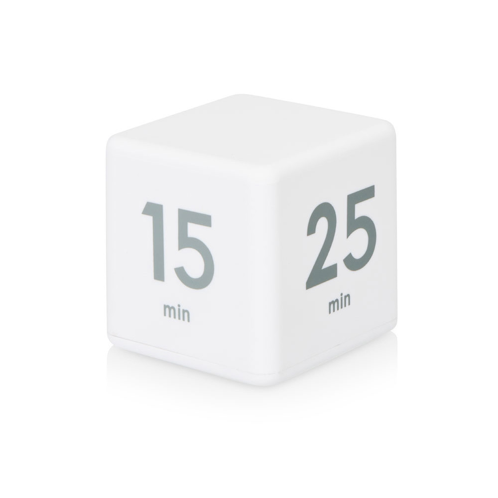 На сторонах куба напечатаны четыре предустановленных времени обратного отсчета (5, 15, 25 и 45 минут). Просто включите таймер и поверните его нужной цифрой наверх для начала отсчета времени. Когда время закончится, раздастся звуковой сигнал.